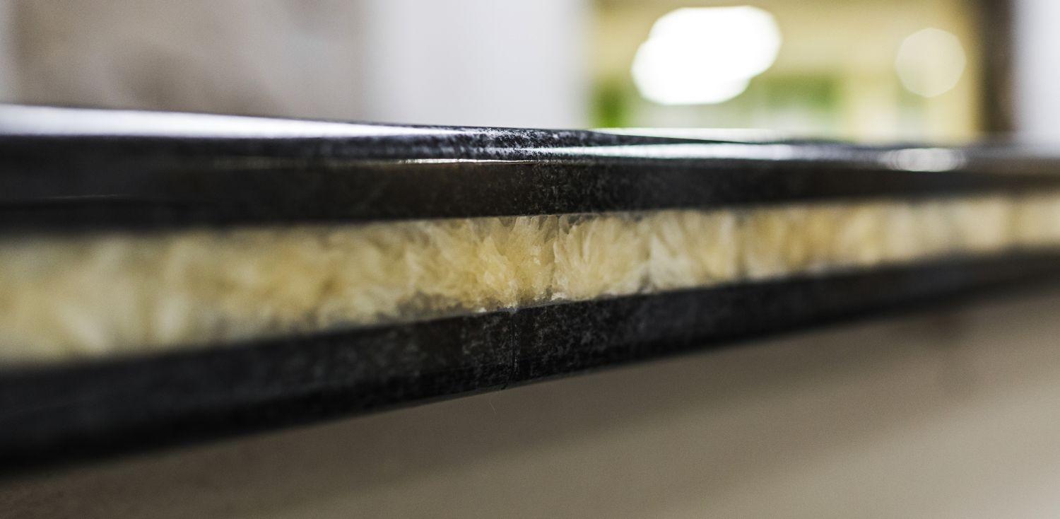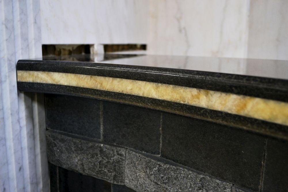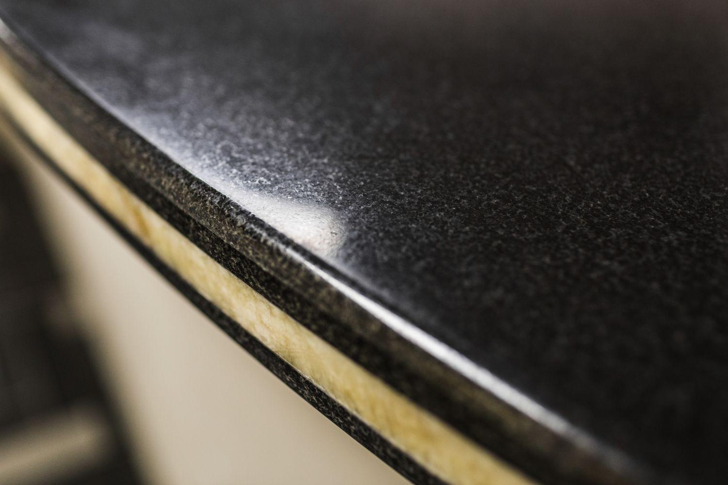Сама поверхность столешницы собрана из двух плит полированного гранита Berry Black и расположенного посередине слоя мраморного оникса Miele.