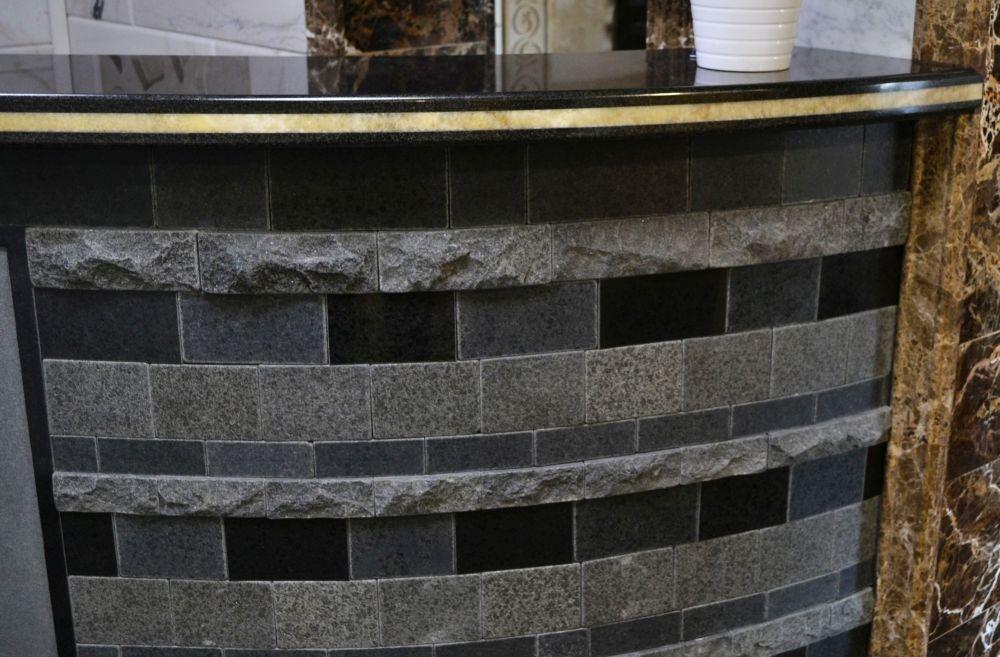Главную роль здесь играет китайский базальт Berry Black. Из него изготовлена изгибающаяся полированная столешница, им же облицован фасад стойки. Для отделки фасада использовался камень с разными фактурами: колотый, шлифованный, термообработанный, потертый щетками.. Стойка прекрасно демонстрирует то, насколько вид камня зависит от обработки поверхности. К примеру, цвет базальта Berry Black может варьироваться от светло-серого до интенсивно-черного.