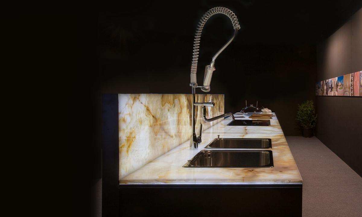 Из мраморного оникса Onyx Bianco выполнены все столешницы для рабочей зоны, им же облицована зона фартука. Подсвеченные панели особенно привлекательны на контрасте с окружающей отделкой в темных тонах.