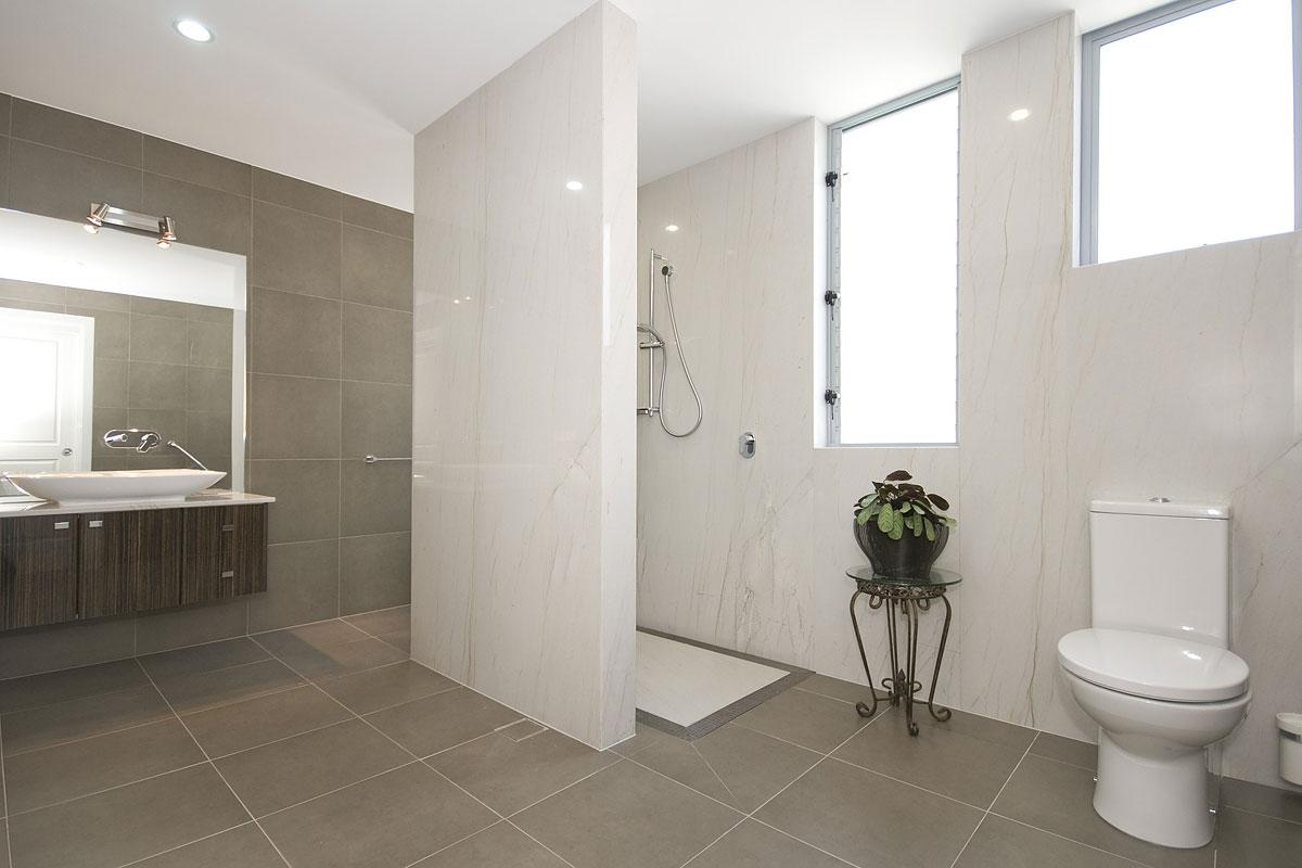 В отделке были задействованы и керамическая плитка, камень, стекло, металл и фарфор. Но нас, конечно, в большей степени привлекает белоснежный сияющий камень с легкими прожилками, которым облицована одна стена и стеновая панель, отгораживающая душ. Этот камень носит название Bianco Macaubas. Он высоко ценится архитекторами, дизайнерами и самими заказчиками. Bianco Macaubas обладает характерным для мрамора видом - белый, немного мерцающий, с прожилками. Но он относится к категории кварцитов, что говорит о его потрясающих прочностных особенностях. Как известно, кварцит достойно противостоит повышенной влажности, истиранию, средствам бытовой химии. За счет его низкой пористости этот камень почти невозможно испачкать. Пигмент загрязняющего вещества просто не сможет проникнуть в структуру породы.
