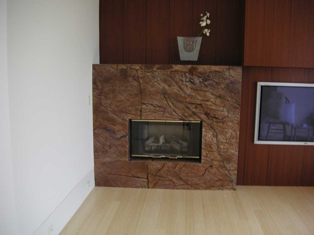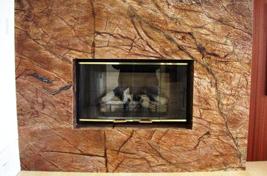 Стена вокруг камина облицована крупной плитой мрамора Bidasar Brown.