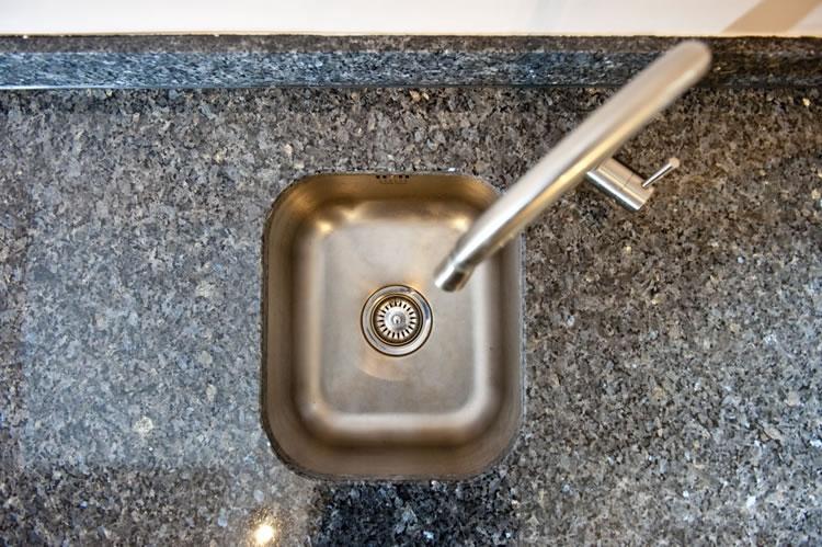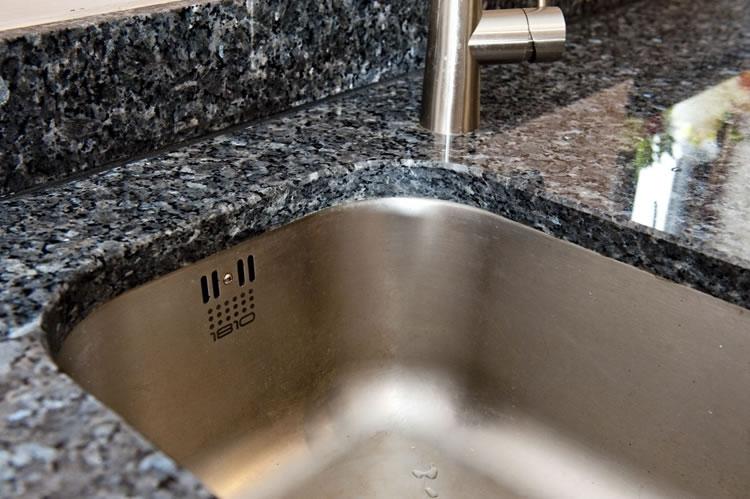 Этим камнем покрыты все столешницы. Из него же выполнены невысокие плинтуса. У окна плинтус поднимается вверх, переходя в каменный подоконник.