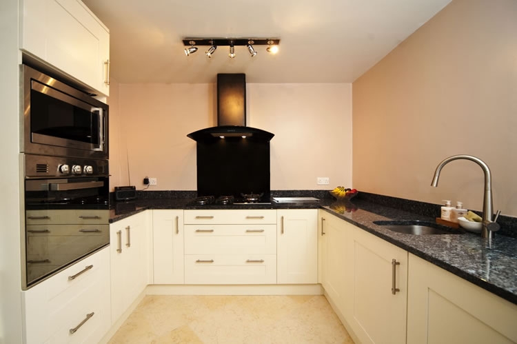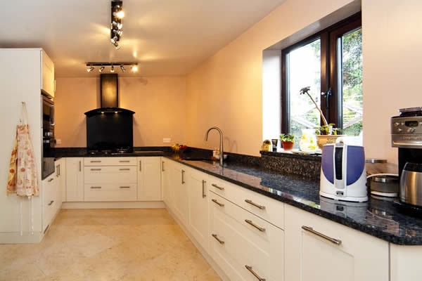 Камень слагает все столешницы по периметру кухни, а также небольшие прилегающие фартуки. Вид торцевого профиля - простой, классический.