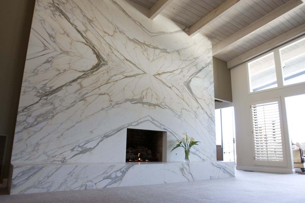 1) облицовка простраства вокруг камина цельными слэбами; 2) раскладка слэбов "бабочка".