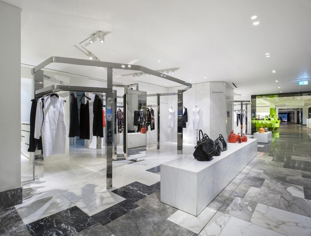 Мы видим реализованный проект мультибрендового бутика. Здесь каждая деталь выполнена под чутким присмотром лучших современных дизайнеров. Пол, общей площадью несколько сот квадратных метров, - авторский проект, подразумевающий тысячи разноформатных плиток лучших сортов мрамора. Тут задействованы сорта семейства Calacatta, а также темно-серые Pietra Grey и Grigio Carnico.