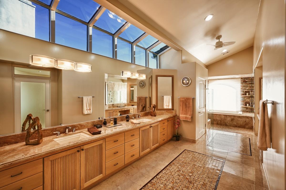Из мрамора Breccia Sardo выполнены столешницы, обрамляющие раковины, и плинтуса.