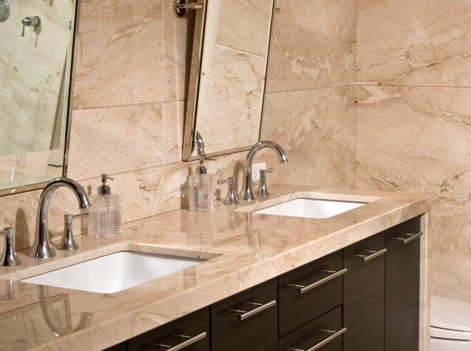 Крупными плитами этого мрамора облицованы все стены. Из него выполнен поддон для душевой, подоконник, а также столешница, обрамляющая зону раковин. Столешница выполнена из деталей, вырезанных из 2-сантиметровых слэбов. Методом склейки изделие превратилось в массивную конструкцию модной П-образной формы.