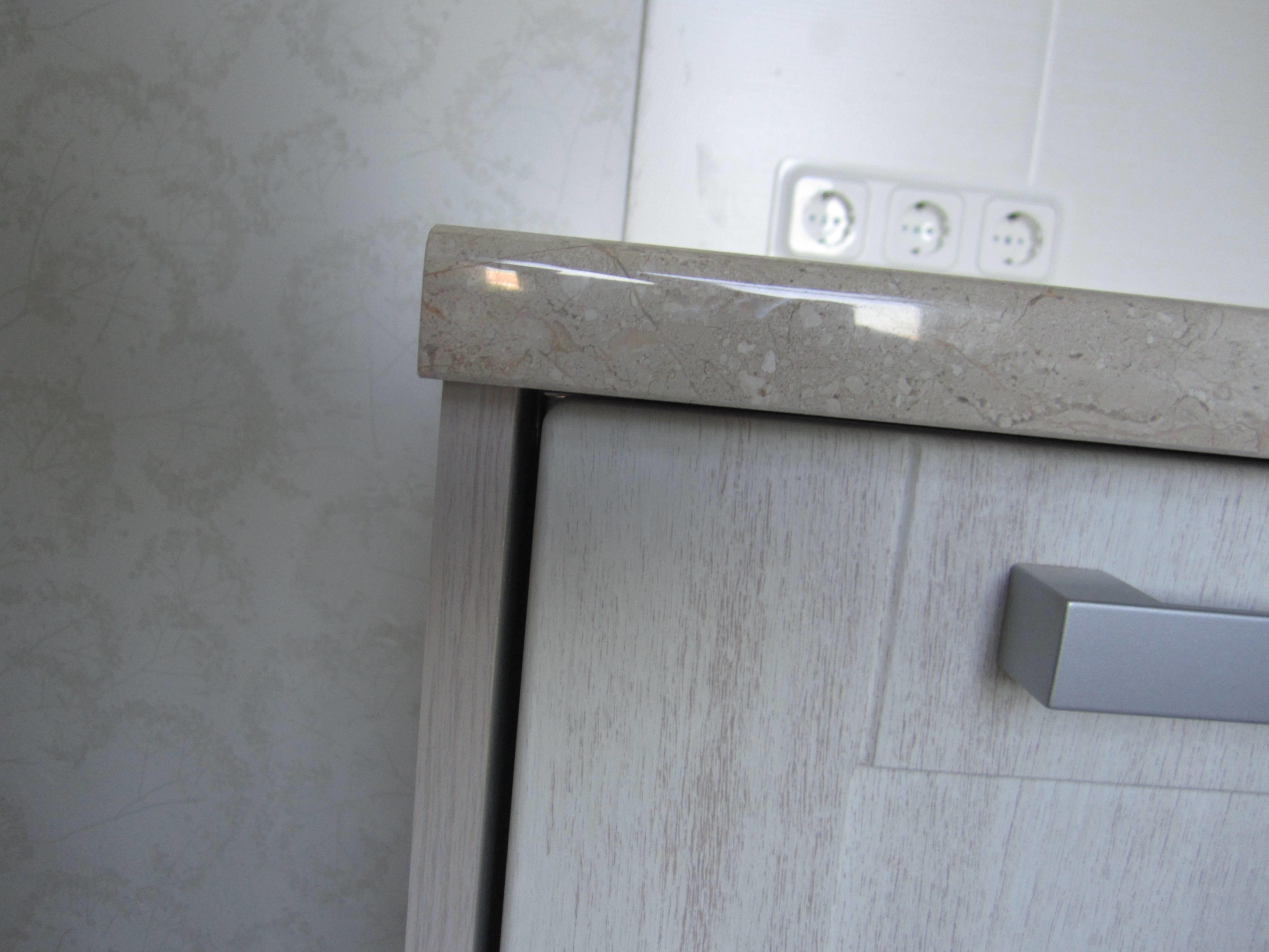 В столешнице вырезаны все необходимые отверстия для раковины, кранов и варочной поверхности. Торцевой профиль - классический квадратный с мягким закруглением.