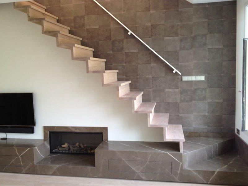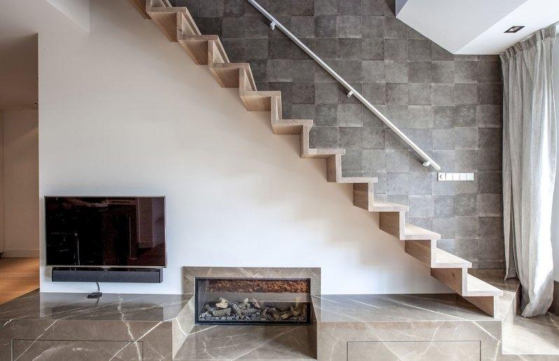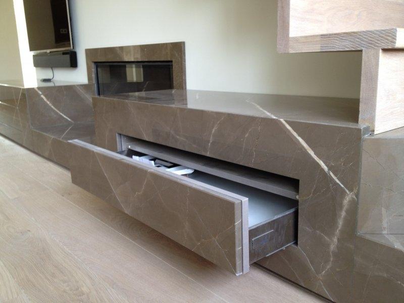 Перед нами проект оригинальной современной отделки. Интерес его заключается в необычном распределении пространства, его конструкции. А конструкция, облицованная мрамором Bronze Amani, представляет собой нижний ярус помещения. Она является необычной тумбой, соединенной с камином, переходящей в две нижние ступени лестницы. Согласитесь, очень эргономично и хитро? При этом композиция выглядит вполне современно и стильно.