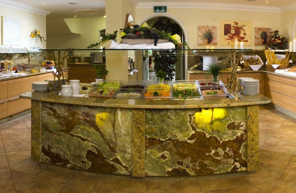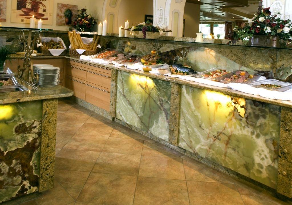 Атмосфера кафе-столовой проникнута восточным колоритом. И этот эффект достигнут только лишь за счет отделки одним из самых "фактурных камней" - мраморным ониксом Pakistan Green. Этот камень добывается в Пакистане и не имеет аналогов во всем мире. Его яркая индивидуальность объясняется удивительной текстурой - кружевным рисунком светлых и бурых прожилок на травянисто-зеленом фоне.
