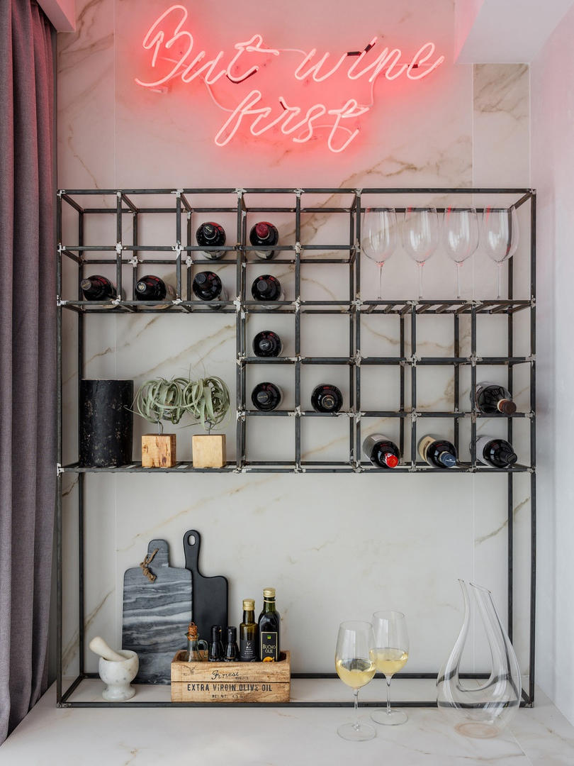 Столешницы и фартук выполнены из элегантного мрамора Calacatta Gold с золотистыми прожилками.