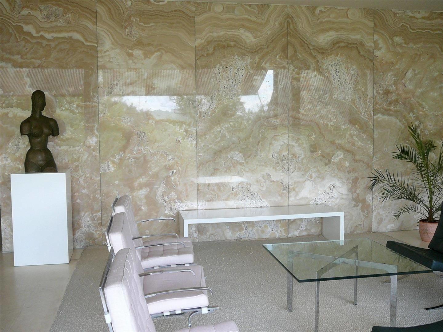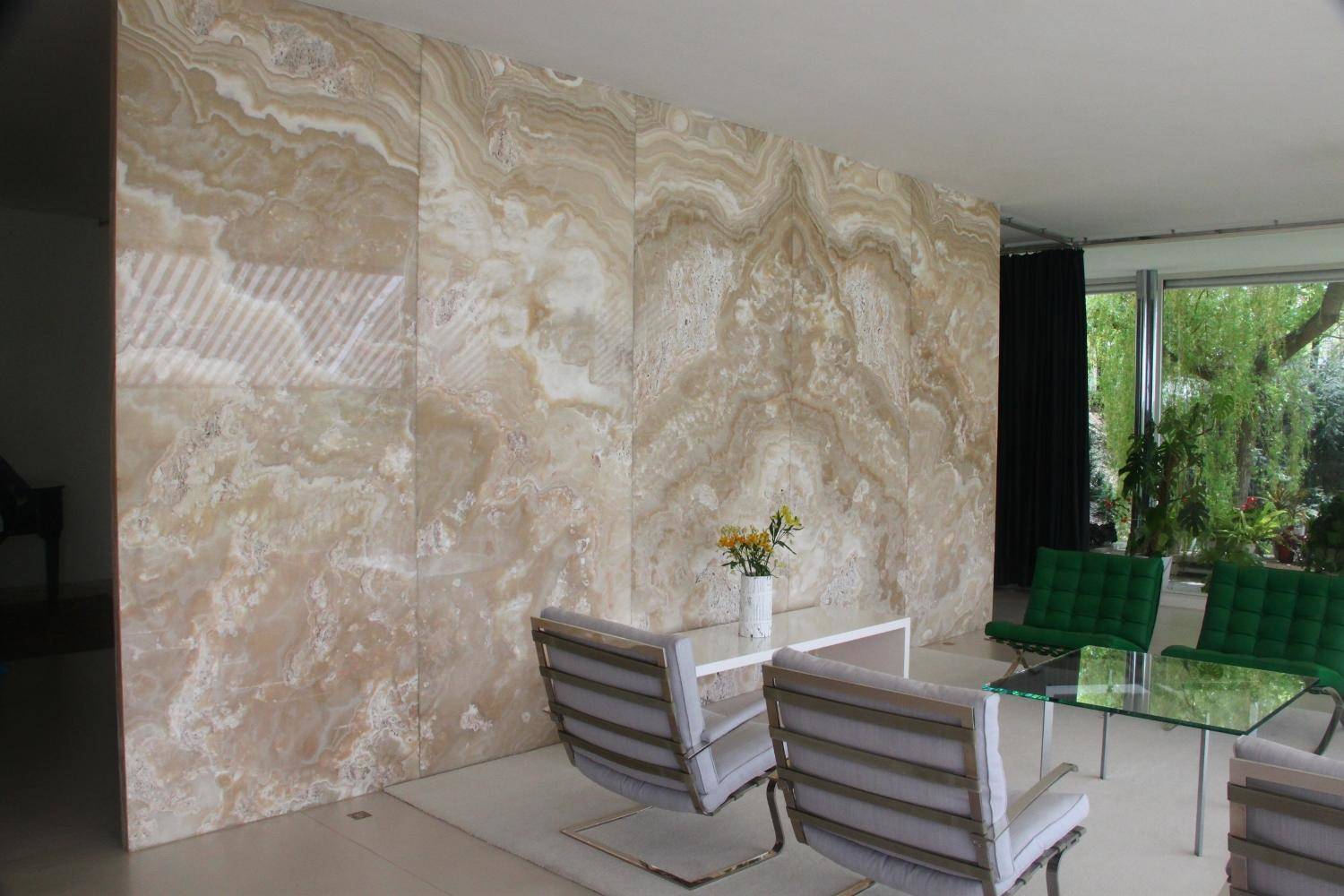 Декоративная стеновая панель из оникса зонирует пространство, являясь модным дополнением интерьера. Панель облицована прямоугольными плитами оникса Onyx Caramel. Использовался камень с полированной фактурой и текстурой Cross Cut (узорчатый рисунок, характерный для распиловки поперек прожилковатости).