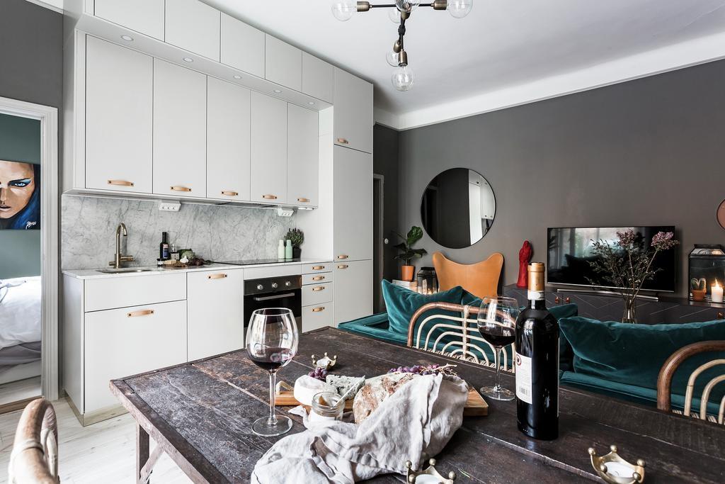 Перед нами современный и модный проект кухни, совмещенной с гостиной.