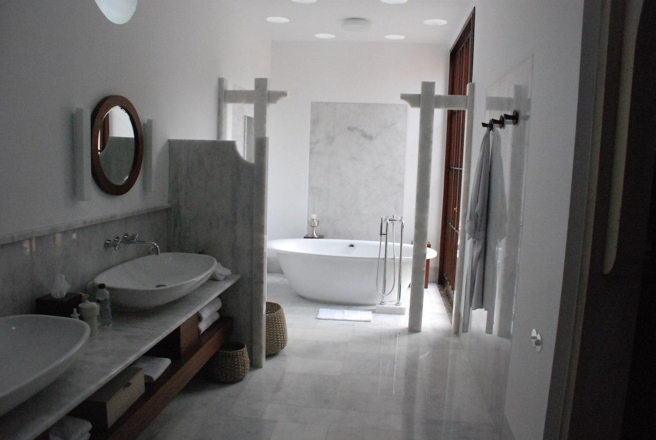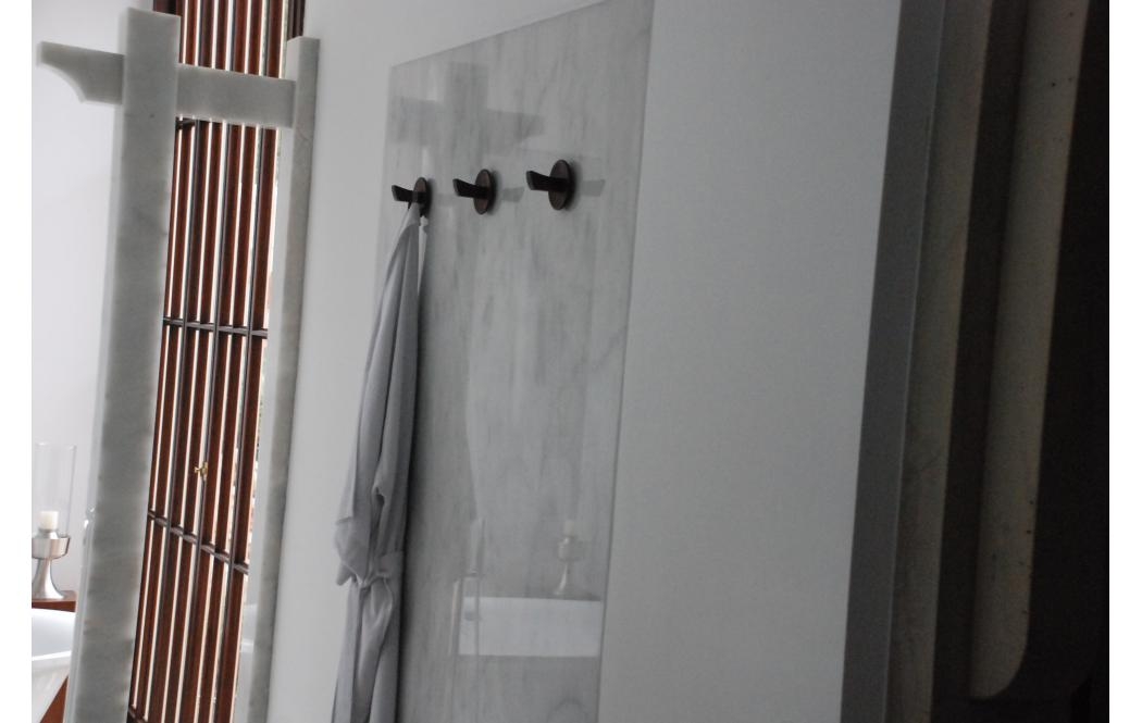И в данном проекте Bianco Carrara смотрится самодостаточно и элегантно. Им облицован пол и частично - стены. Интересная и весьма оригинальная идея прослеживается в некоторых деталях интерьера. К примеру, каменные "ширмы", обрамляющие зону умывальника. Или декоративные колонны-столбы.