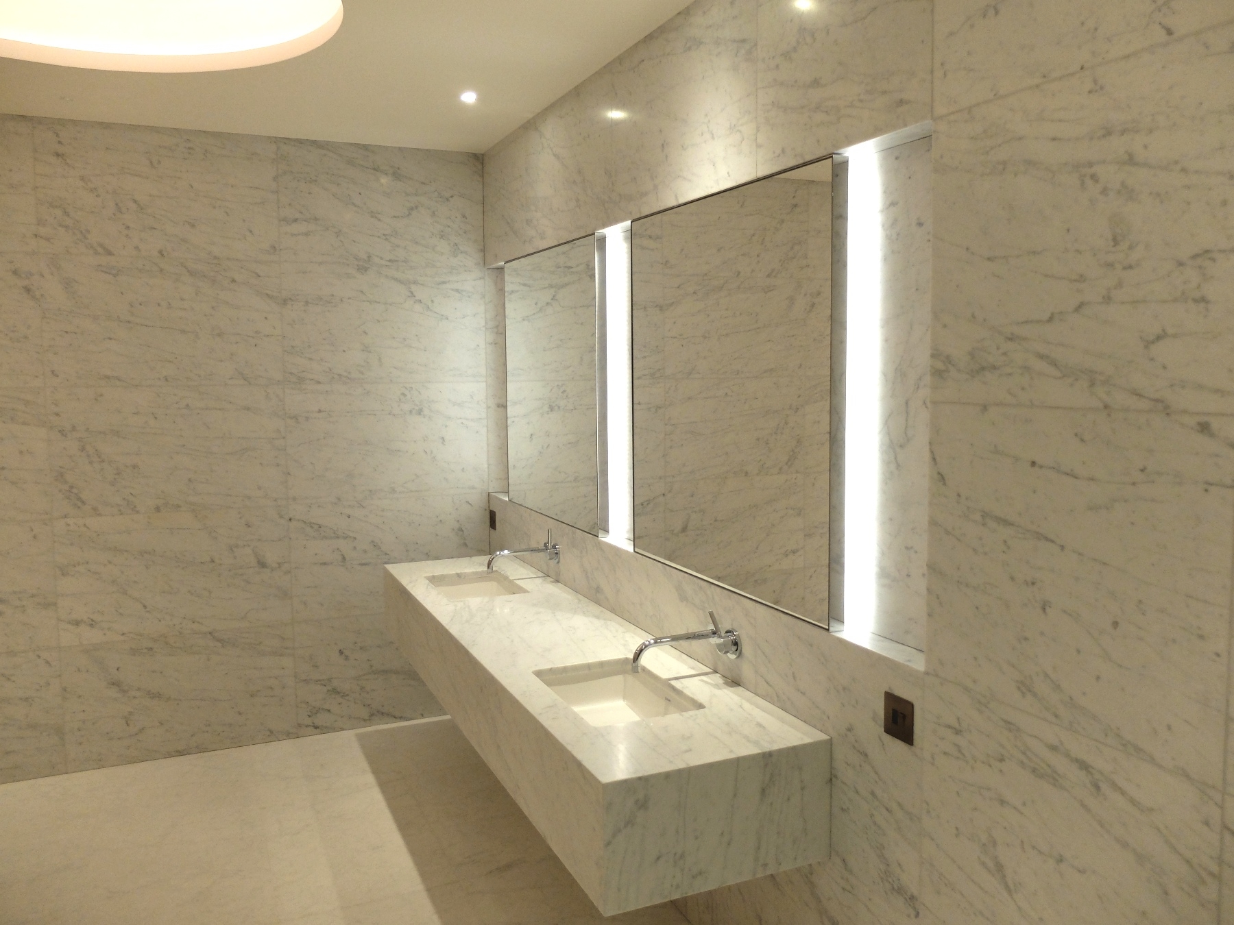 Для проекта была заказана крупная прямоугольная плитка с одним направлением прожилковатого рисунка. Едва заметный голубоватый оттенок мрамора привносит в помещение атмосферу свежести и чистоты.