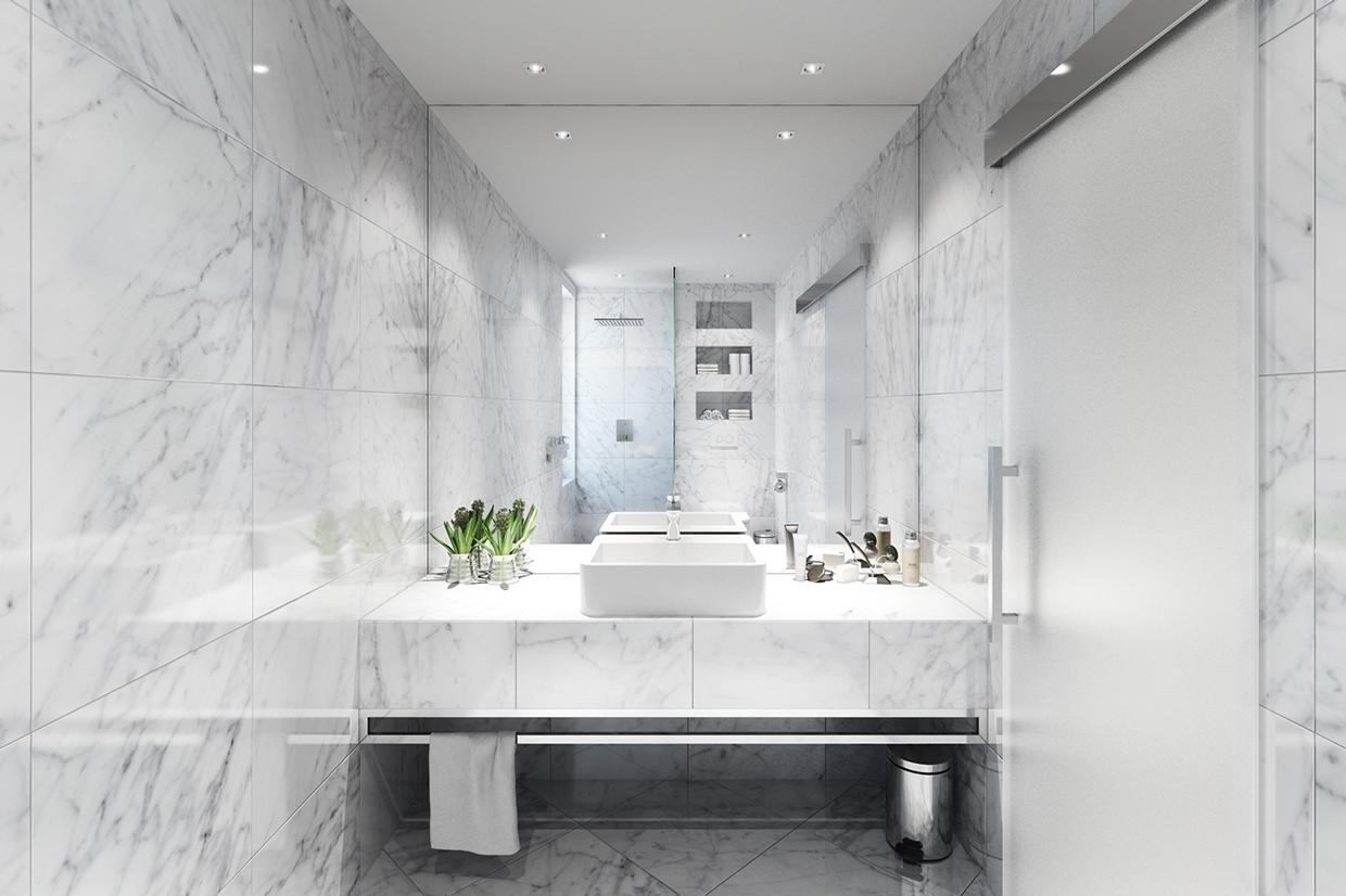В данном же проекте дизайнер сделал ставку именно на текстуру камня. Этим камнем облицованы стены и пол, столешница, подоконник и ниши в стенах. Помимо полной отделки Bianco Carrara, ванная лишена какого-либо дополнительного декора. Он здесь просто не нужен. Благородная текстура камня наполнила пространство прохладной свежестью, сиянием и лоском.
