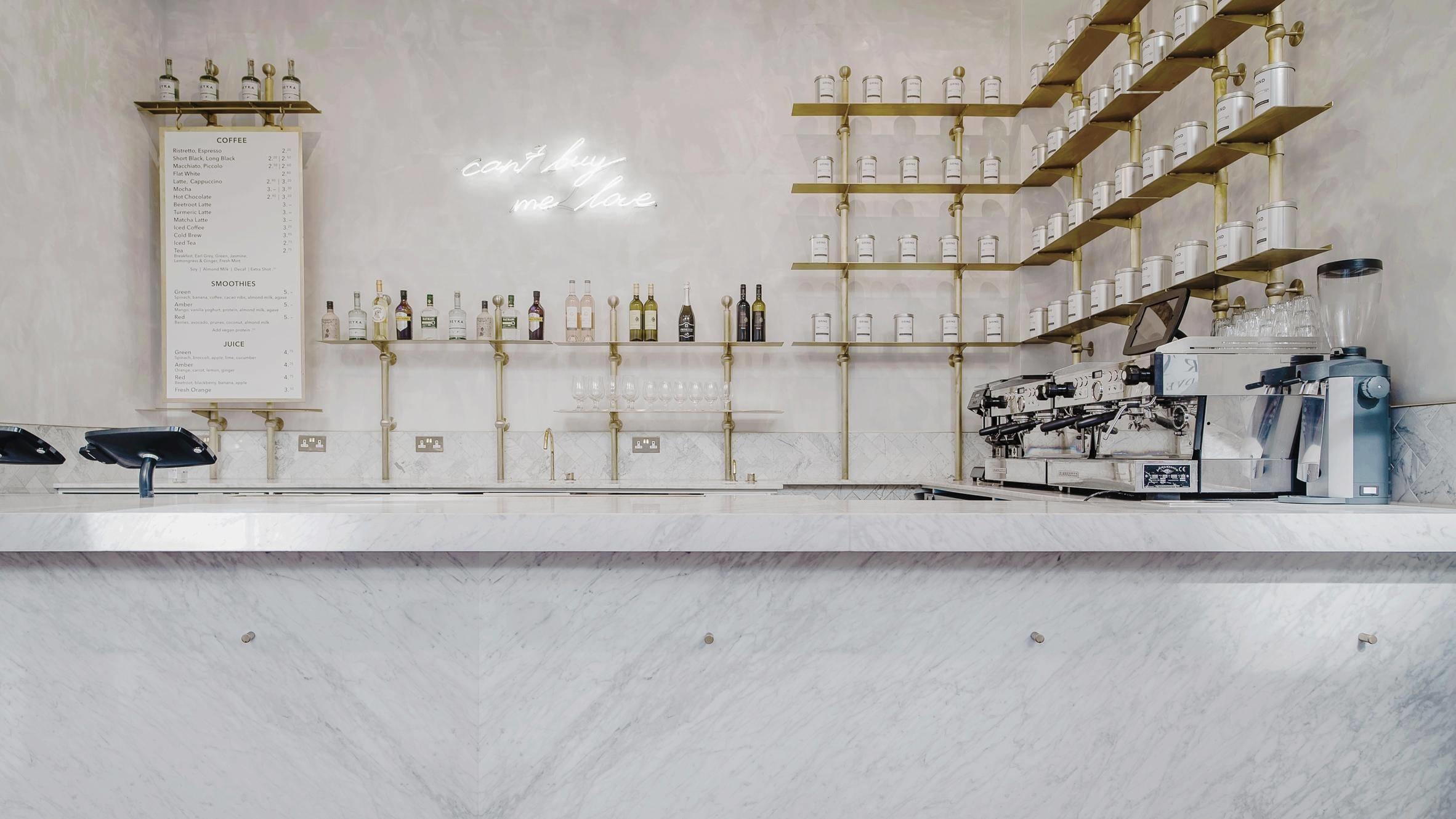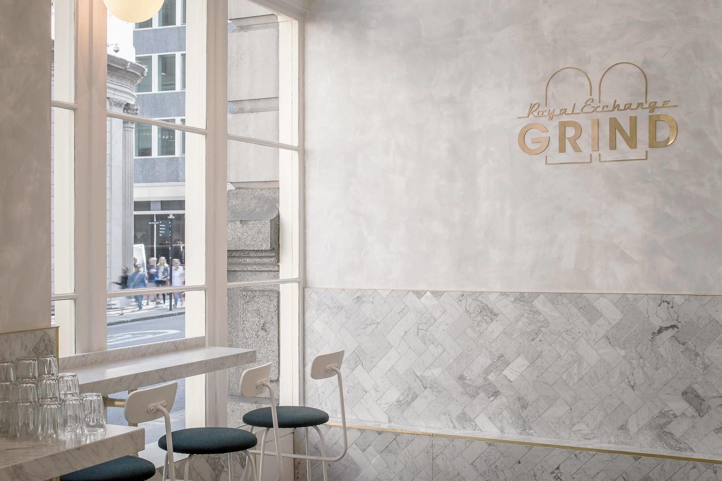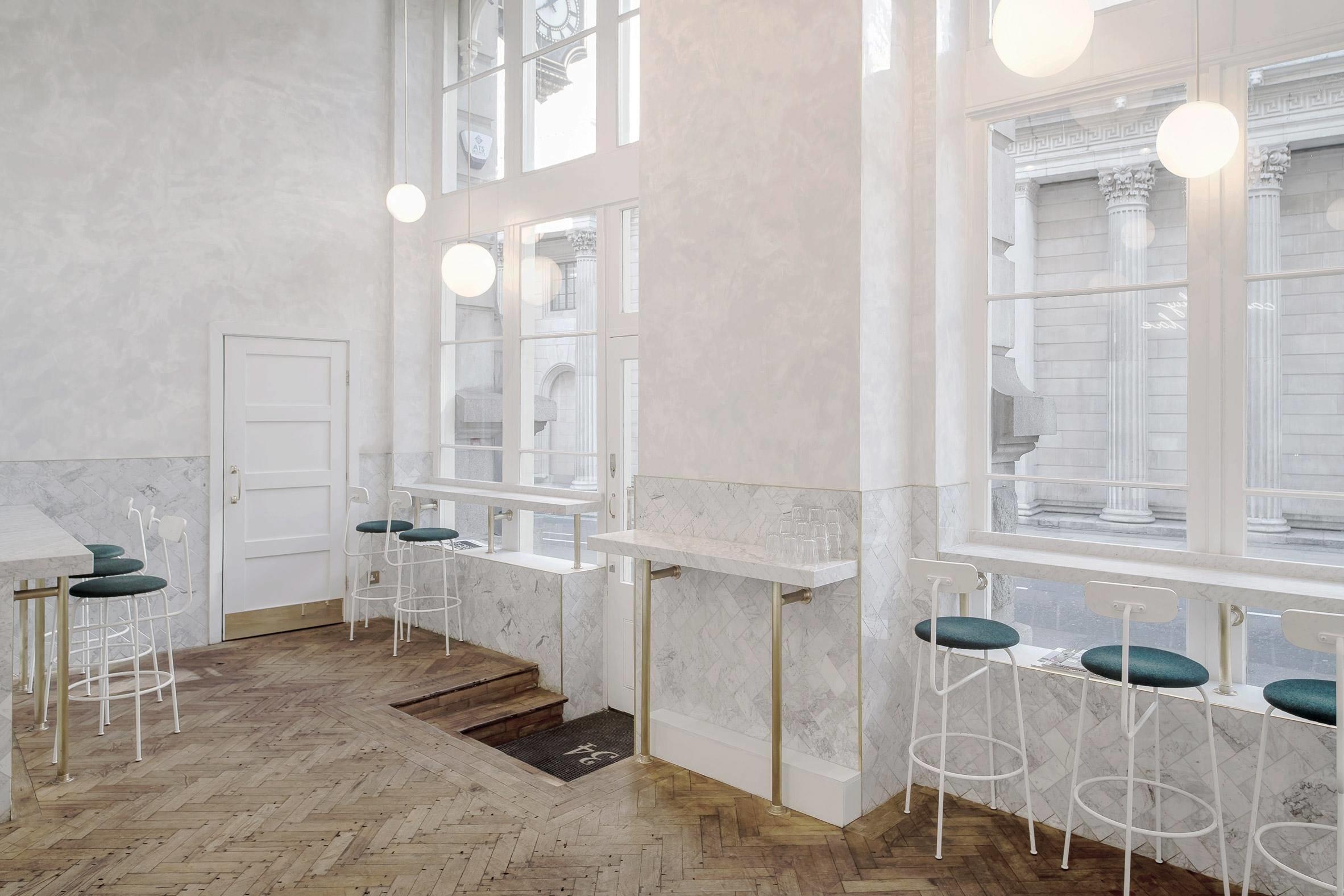 Перед нами кафе, расположенное в здании лондонской биржи - старинном здании, основанном в 16 веке. В 2011 году проект реставрации и создания интерьера был поручен австралийской студии Biasol. "Этот проект предоставил нам поистине уникальный опыт в одном из самых узнаваемых архитектурных сокровищ Лондона," - поделился главный архитектор Biasol. - "Это было очень важно, наш подход отразил великое почтение к истории Королевской биржи." Biasol досконально изучил историю этого пространства, чтобы соблюсти и подчеркнуть его яркие стилистические черты.
