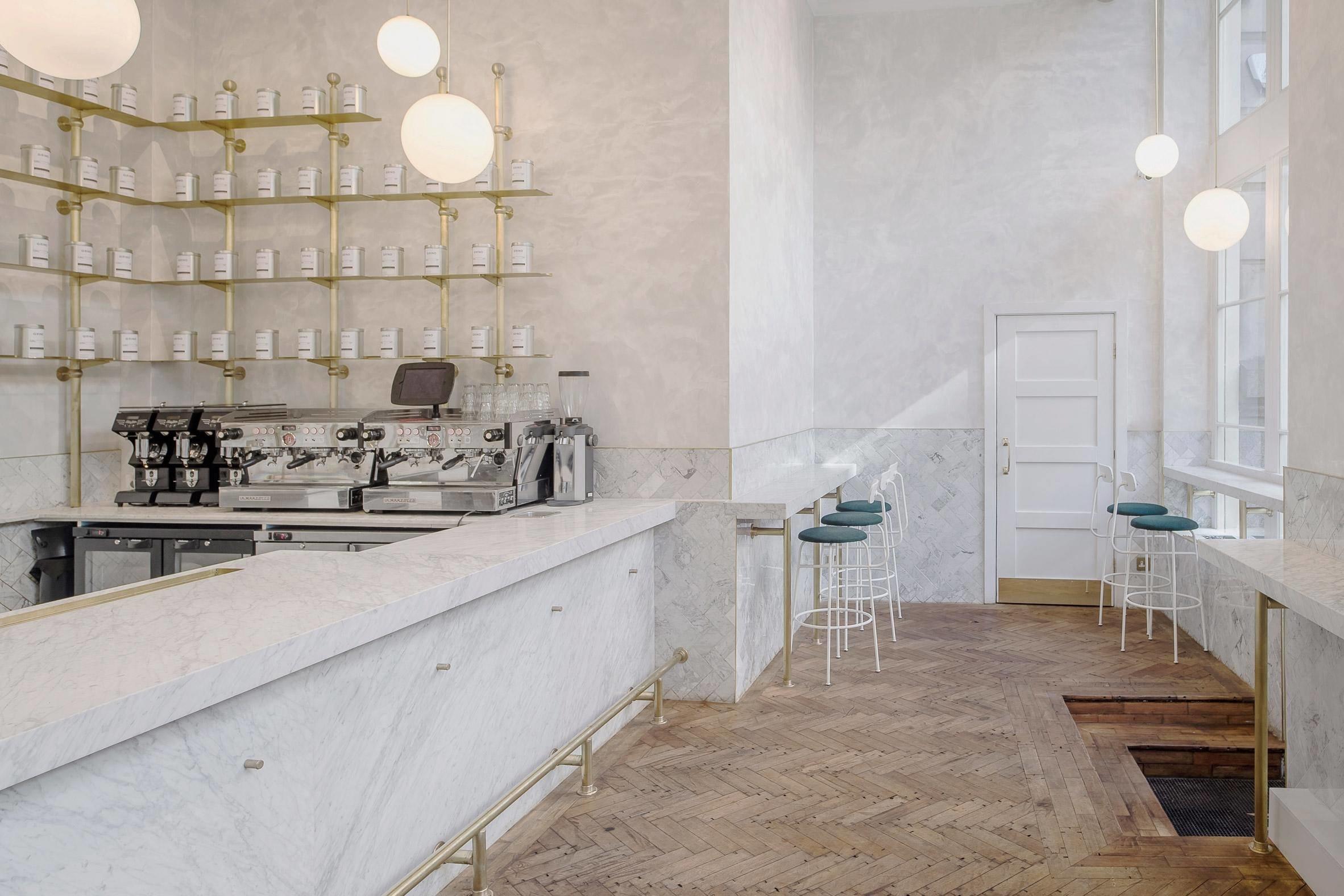 Чтобы подчеркнуть простор и мощную энергетику пространства, архитекторы использовали чистейший каррарский мрамор. Им облицованы барная стойка и столики-подоконники по периметру. Отделка нижней части стены осуществлена плиткой Bianco Carrara в форме елочки, что повторяет орнамент деревянного пола.