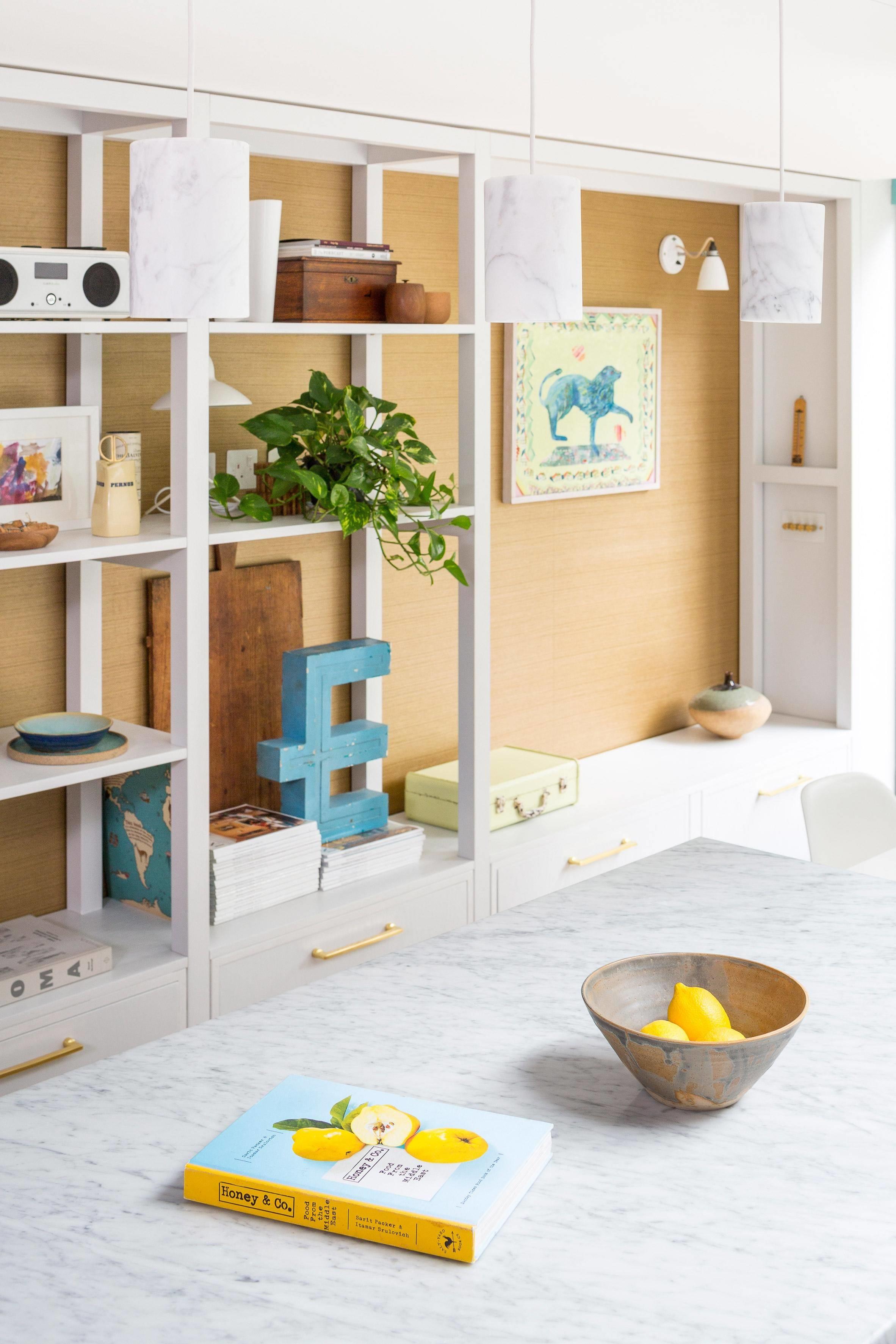 Все столешницы выполнены из самого знаменитого в мире мрамора - Bianco Carrara из Италии. Голубовато-белый с частой сетью серых прожилок - он всегда смотрится благородно и дорого. Центральный остров представляет собой П-образную конструкцию. Этим же камнем облицована рабочая зона: поверхность, фартук и нависающие полки.