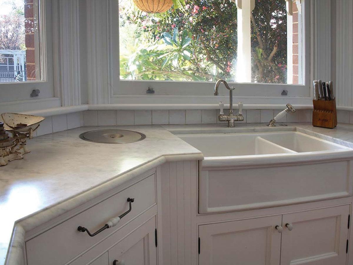 Дизайнер очень удачно выбрал фактуру поверхности столешниц - это лощение. Лощеный Bianco Carrara приобрел более светлый тон и мягкую бархатистую поверхность.