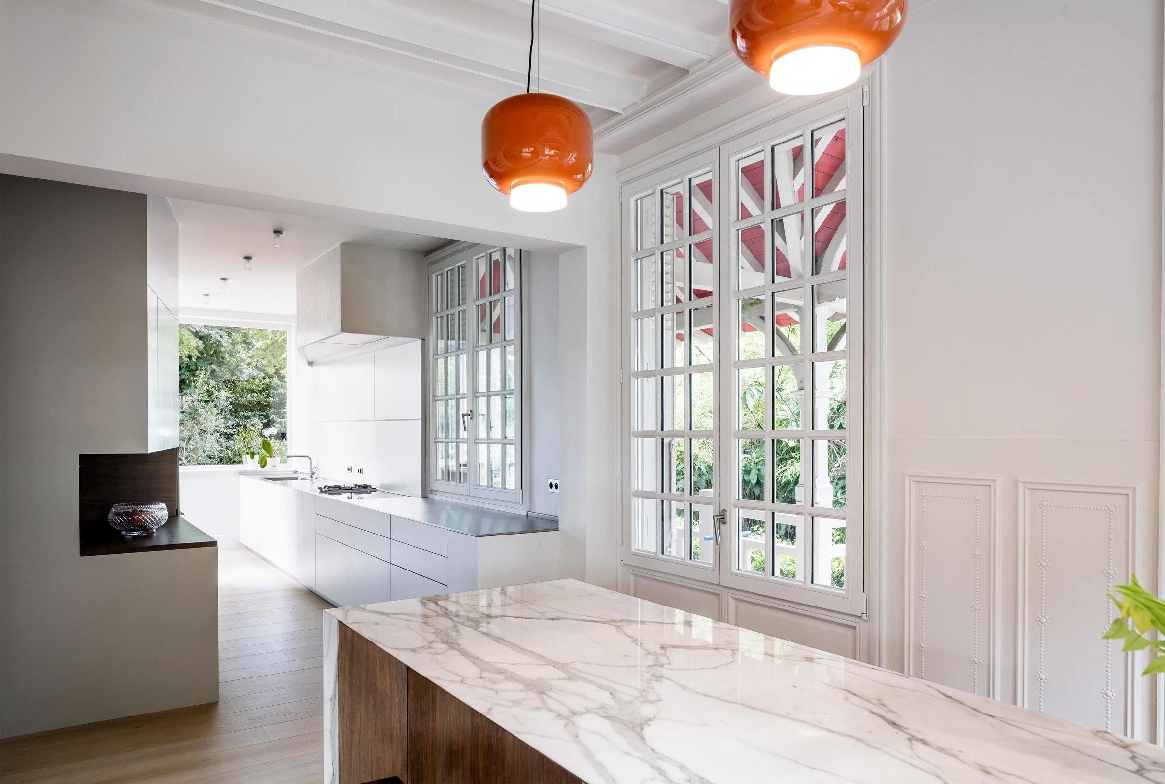 В этом проекте дизайнер решил использовать один из самых изысканных итальянских сортов мрамора - Calacatta Gold. Это белоснежный скрытокристаллический камень с выразительной сетью золотистых прожилок.