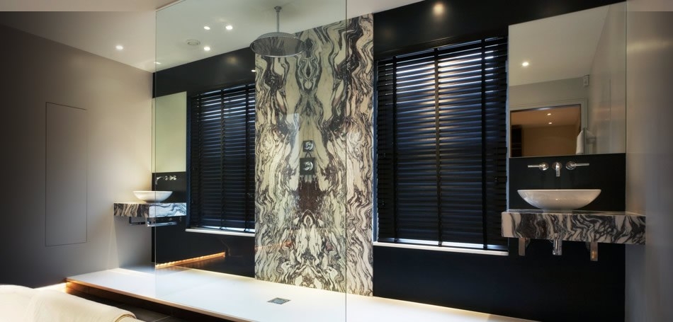 Из этого камня вырезаны миниатюрные столешницы под раковины. А центральным элементом интерьера стала стеновая панель в душевой кабине. Она представляет собой крепление двух плит мрамора по методу "бабочки" - когда рисунок прожилок одной плиты зеркалит рисунок второй. Интересно, что и вся планировка ванной симметрична; а ось комнаты проходит точь в точь по центральной линии панно.