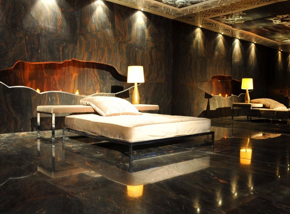 Этот уникальный интерьерный проект реализован легендарной компанией Antolini. Итальянские каменщики выбрали кварцит Copper Dune, привезенный из Бразилии, для комплексной отделки всего пространства спальни.