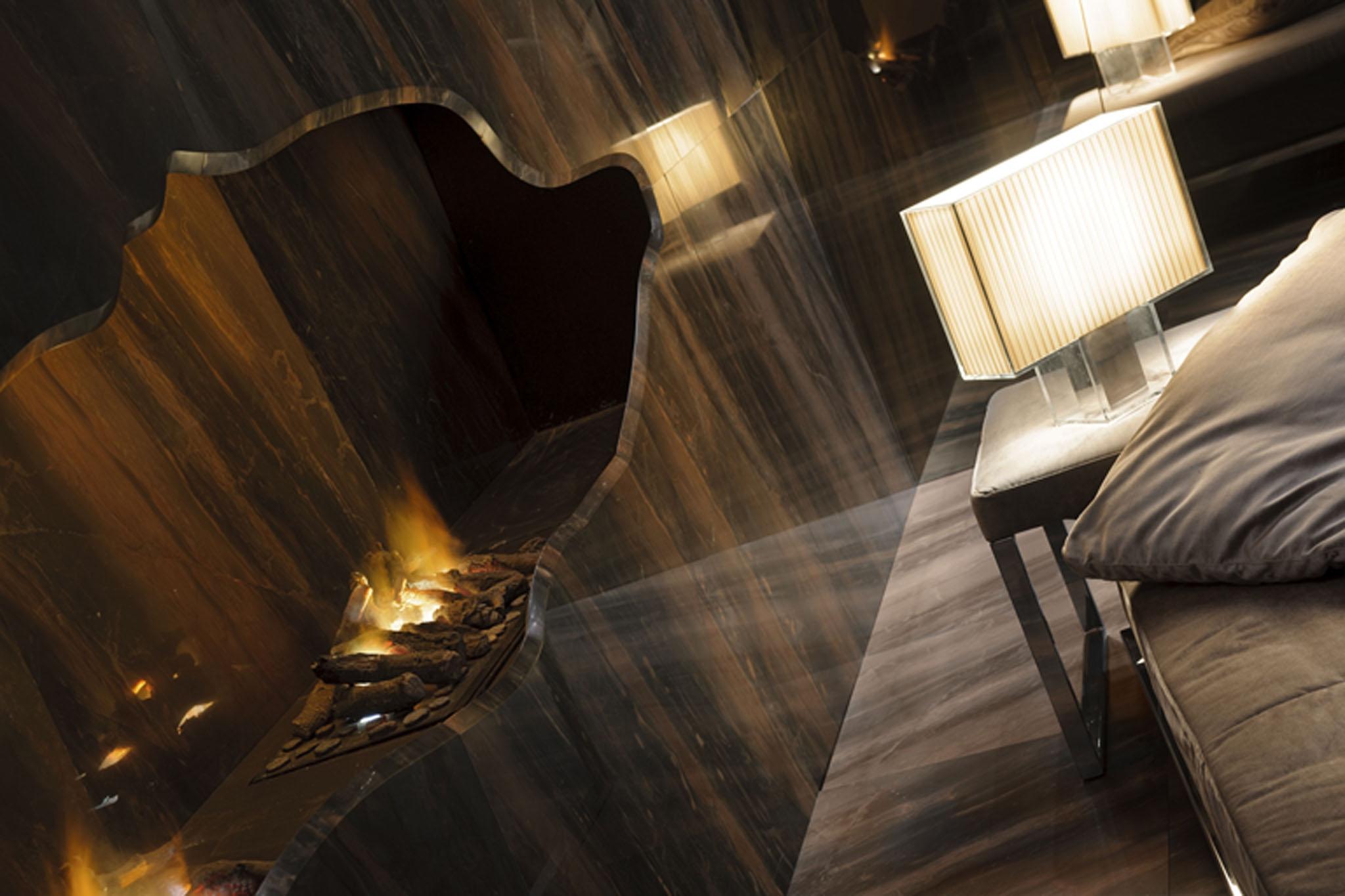 Этим камнем облицованы стены и пол. Особенно примечательна объемная ниша в стене, которая представляет собой необычный каминный портал. В обрамлении камня с "рваным" краем, портал напоминает расщелину в скале.