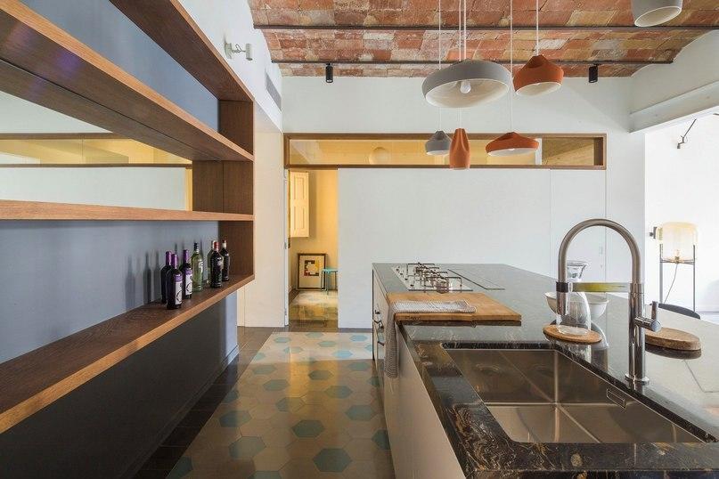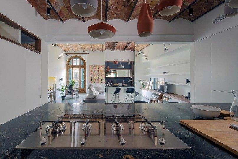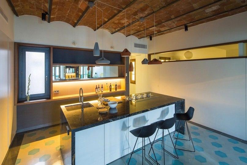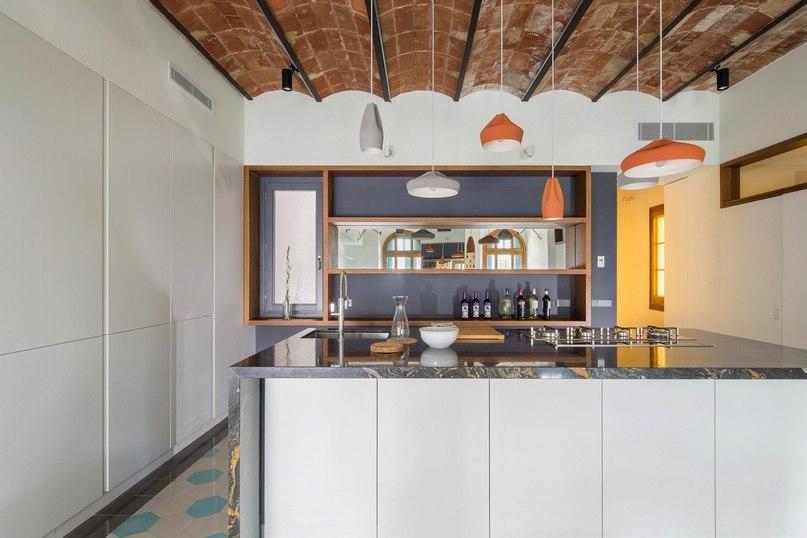 Пространство кухни совмещено с гостиной. И барная стойка стала отличным способом зонировать пространство, символически разделить территорию.