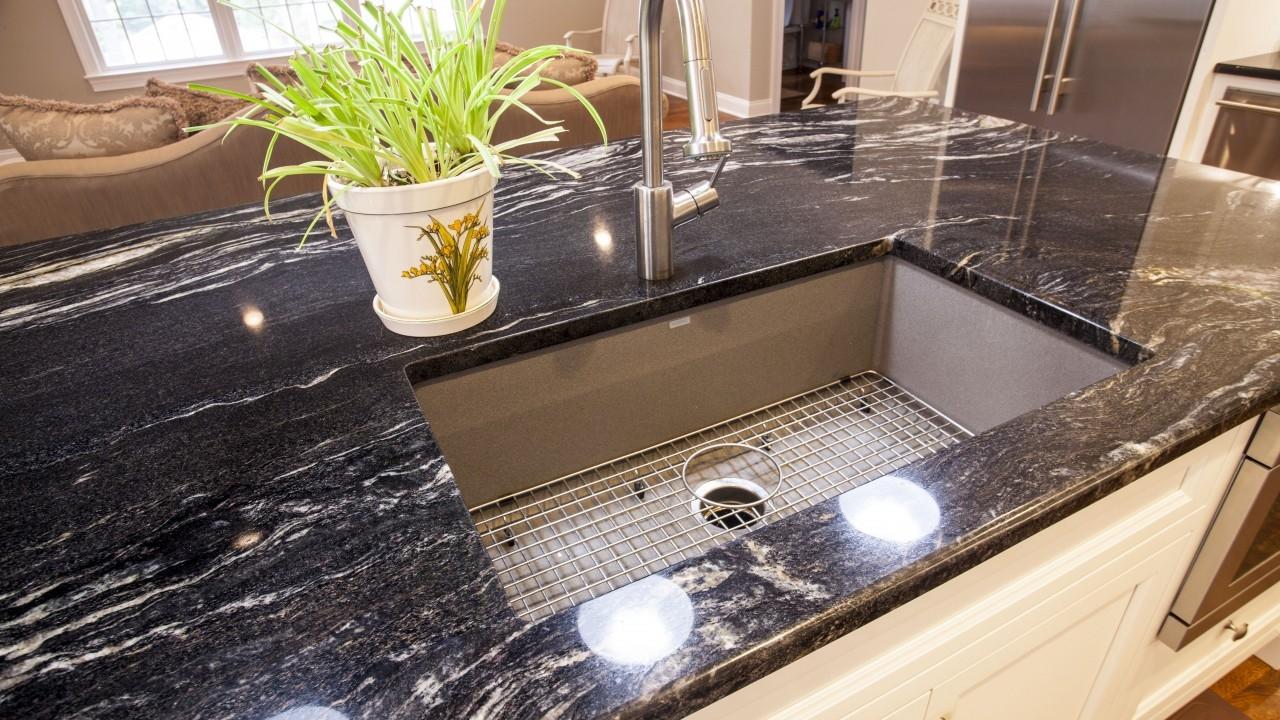Заказчик кухни искал камень черного цвета с оригинальным рисунком. Ведь необычный природный "принт" способен привнести изюминку, оригинальность в проект, не сильно выделяясь из общего контекста.Рабочие зоны по периметру покрыты обычным черным базальтом, а вот столешница центрального острова требовала к себе особенного отношения. Заказчик не намеревался ограничивать дизайн абсолютно черными поверхностями. И тогда мастера стали искать подходящее решение.