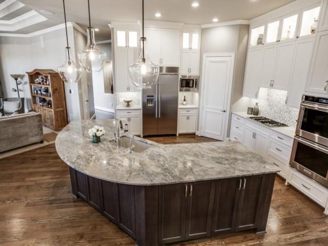Центральная столешница для этой кухни выполнена из 2-сантиметрого слэба кварцита Cielo. Мастера выполнили свою работу превосходно: на изделии почти незаметны стыки и швы.