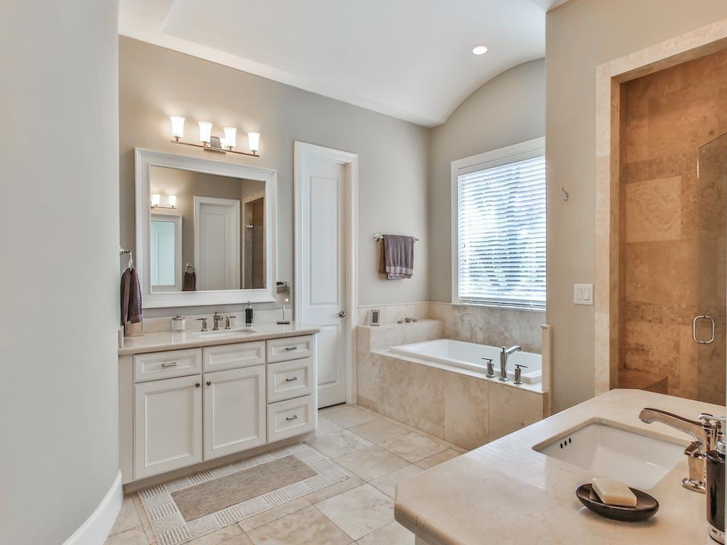 Для отделки были задействованы два вида камня кремового оттенка: мраморизованный известняк Crema Marfil и травертин Travertine Cream.