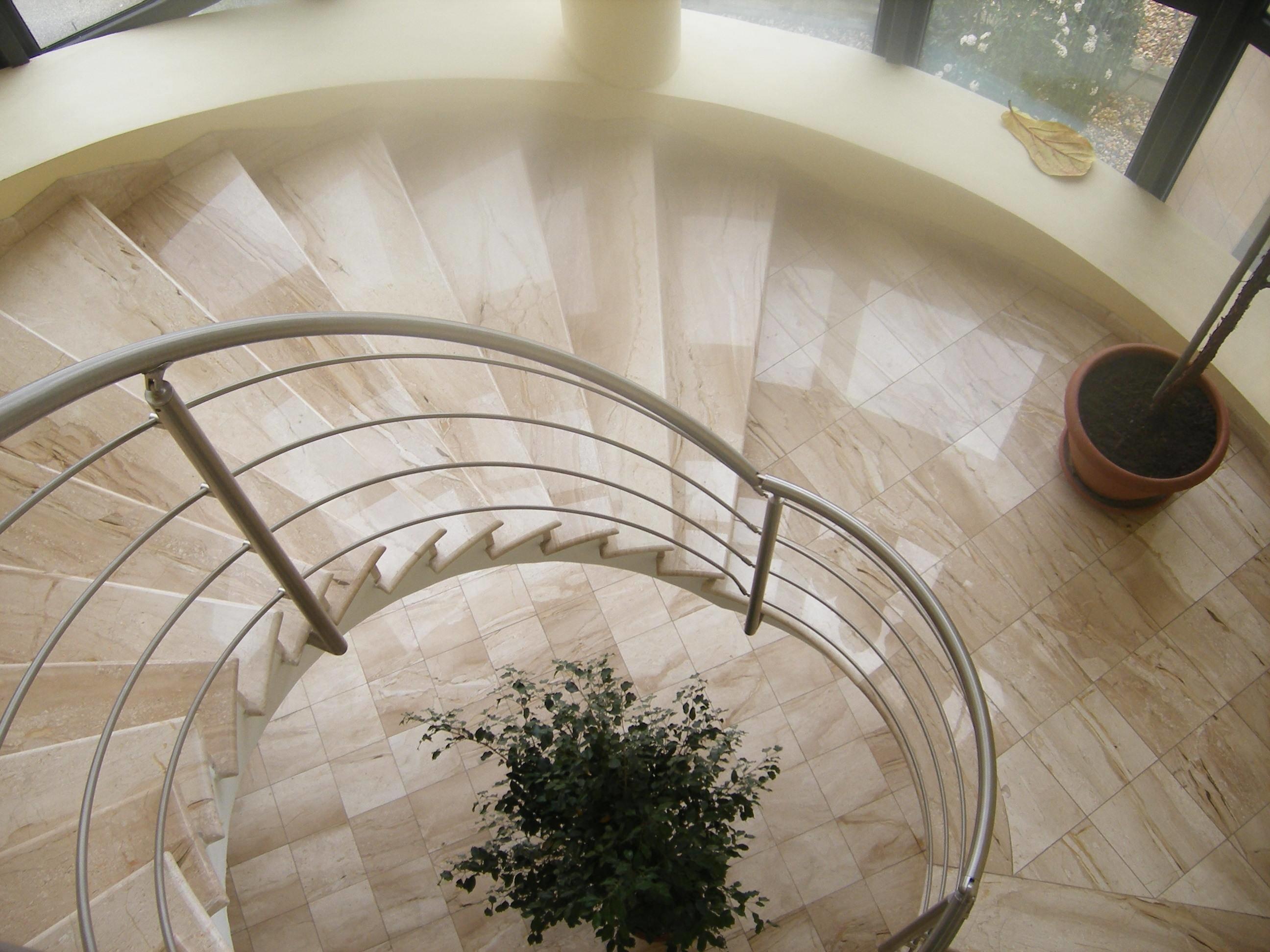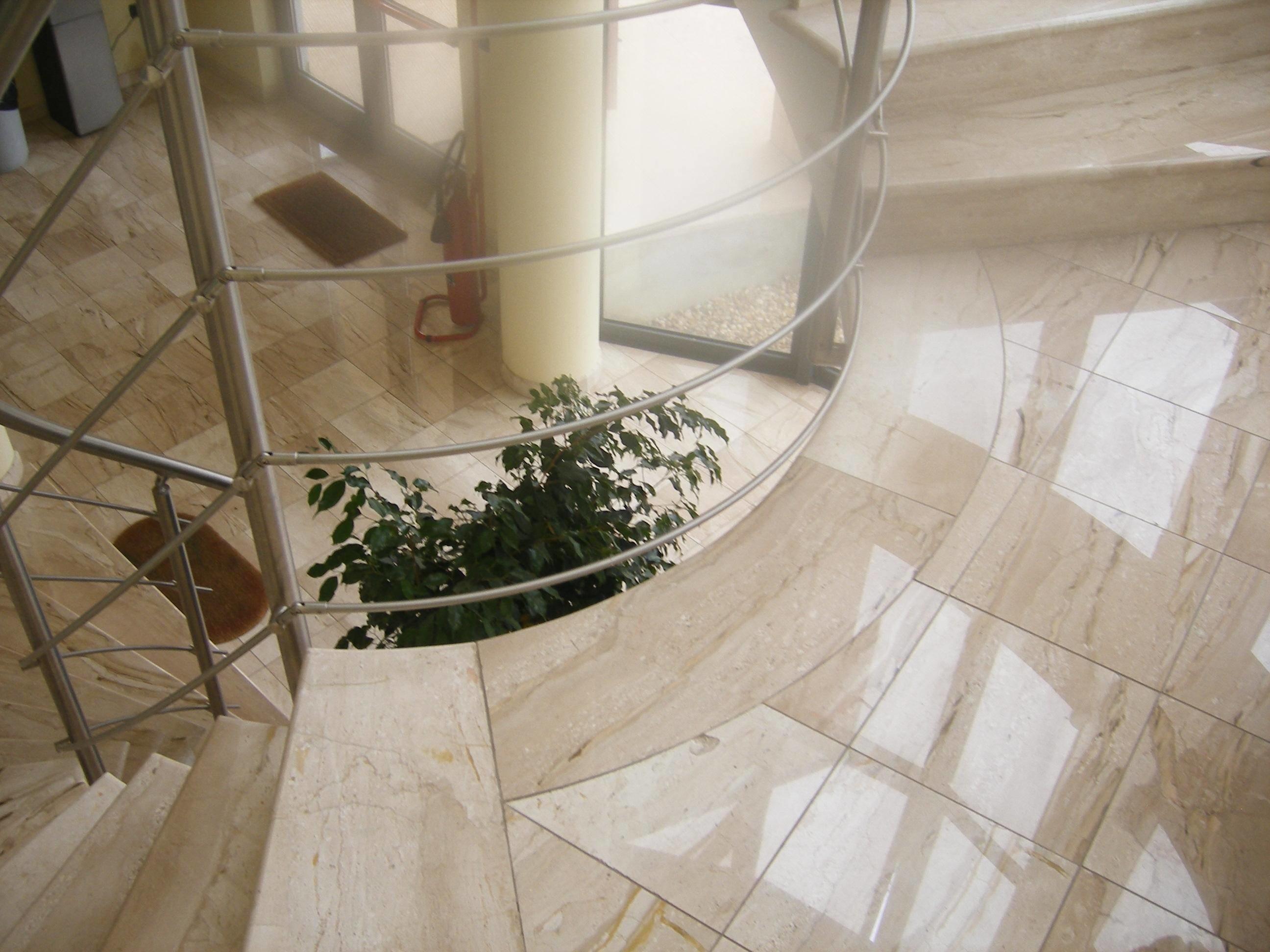 Винтовая лестница с большим диаметром и полы в бизнес-центре облицованы полированным бежевым мрамором Diano Reale. Площадки выложены квадратной плиткой камня, а ступени и подступенки - цельными элементами.
