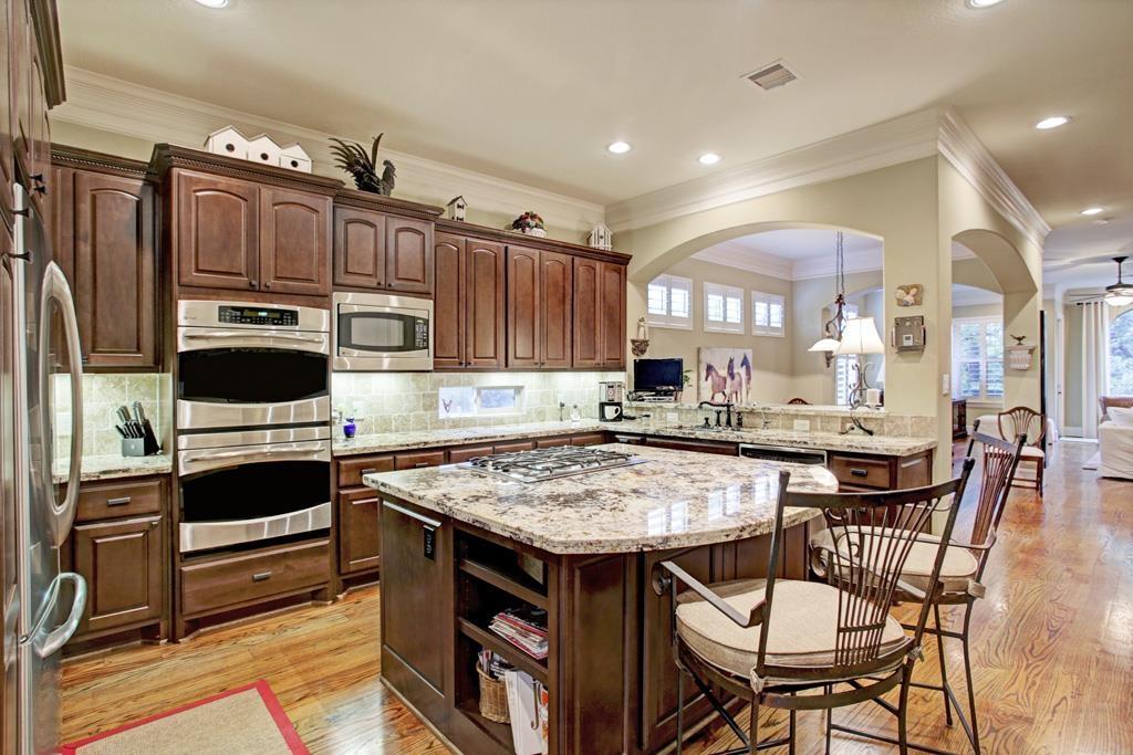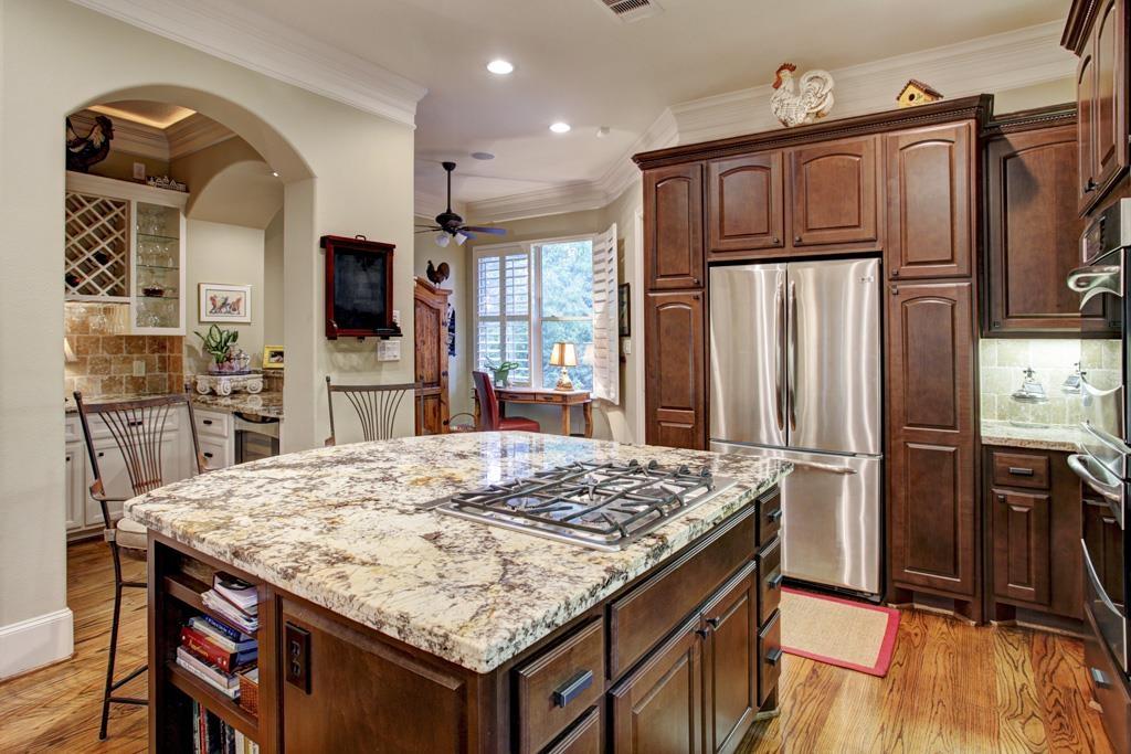 Все рабочие поверхности, а также столешница центрального острова, покрыты этим камнем. Для проекта были задействованы слэбы толщиной 2 сантиметра с полированной фактурой. На торцах каждая столешница укреплена подклейкой дополнительной полосы, отчего изделия кажутся массивными и основательными.
