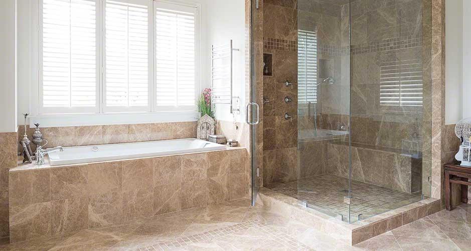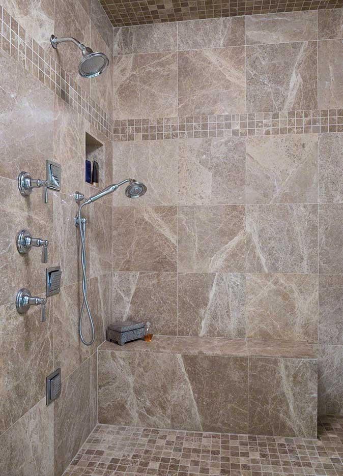 Перед нами проект ванной комнаты с комплексной отделкой мрамором Emperador Light. Здесь использовался камень в формате плитки и мозаичных фрагментов. Фактура поверхности - лощение, что придает отделке эту бархатистую поверхность без блеска.