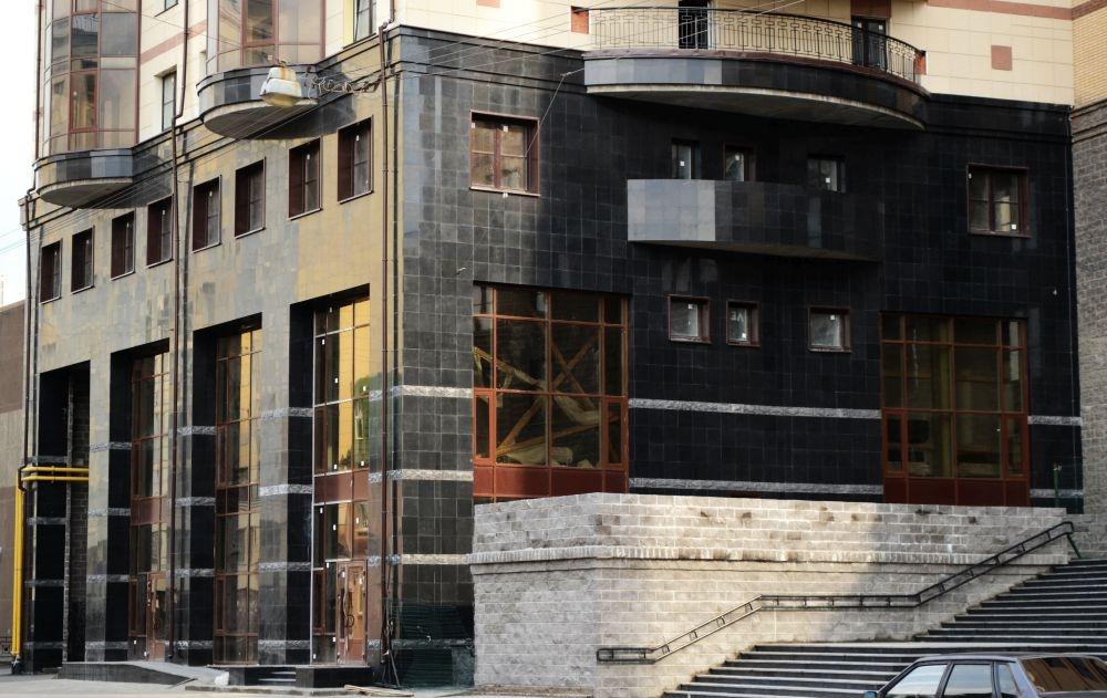 Мы поставляли камень для облицовки нижнего яруса фасада. Заказчик выбрал бюджетный и привлекательный, долговечный и морозостойкий камень - китайский базальт Berry Black.
