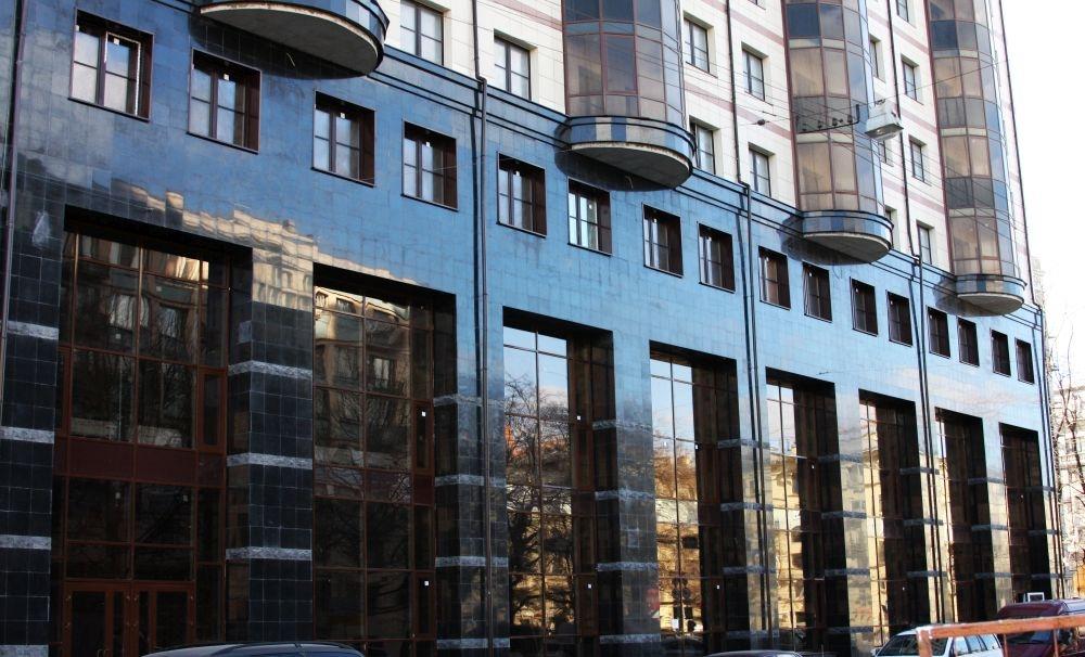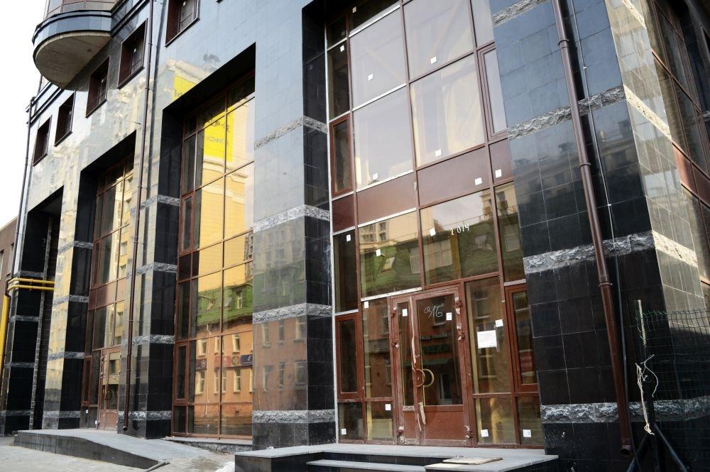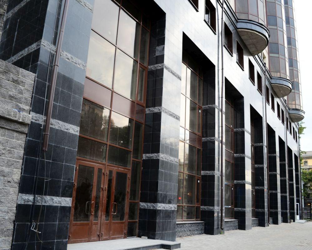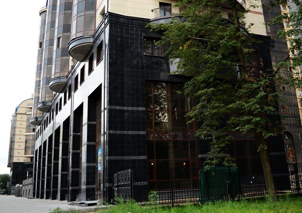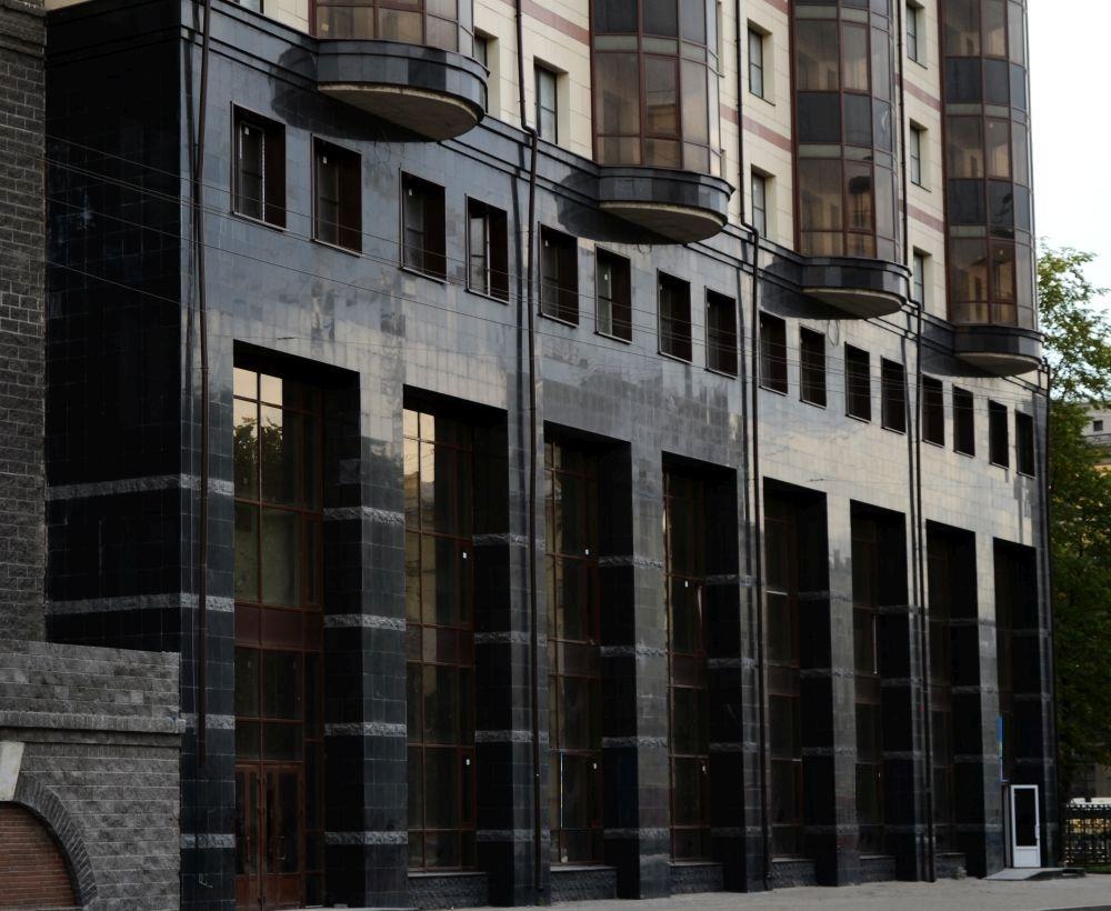 Мы изготовили квадратную плитку с полированной фактурой - для отделки большой площади фасада, а также нижнего яруса, проходящего по нижним балконам. Мы же делали полосы с колотой поверхностью (такая фактура носит название "скала"), которые чередуются с глянцевой плиткой. За счет этого сочетания создается основательный и фундаментальный вид здания. Колотый серый камень сочетается с бетонным материалом лестницы и шлифованным гранитом на ступенях.