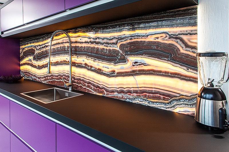Заказчик решил разбавить матовую гладь искусственных материалов при помощи фартука из натурального мраморного оникса. Из всего многообразия сортов был выбран Onyx Fantastico - пестрый, полосчатый, с контрастными полосами полупрозрачного и темно-красного цвета. Темные вкрапления интересено сочетаются с кухонным гарнитуром ярко-фиолетового цвета.