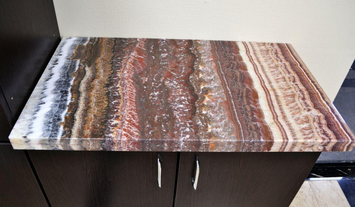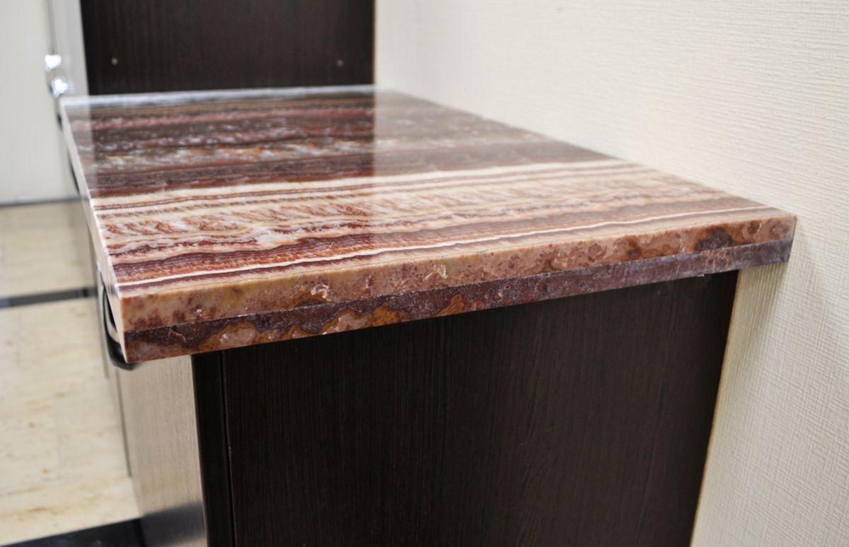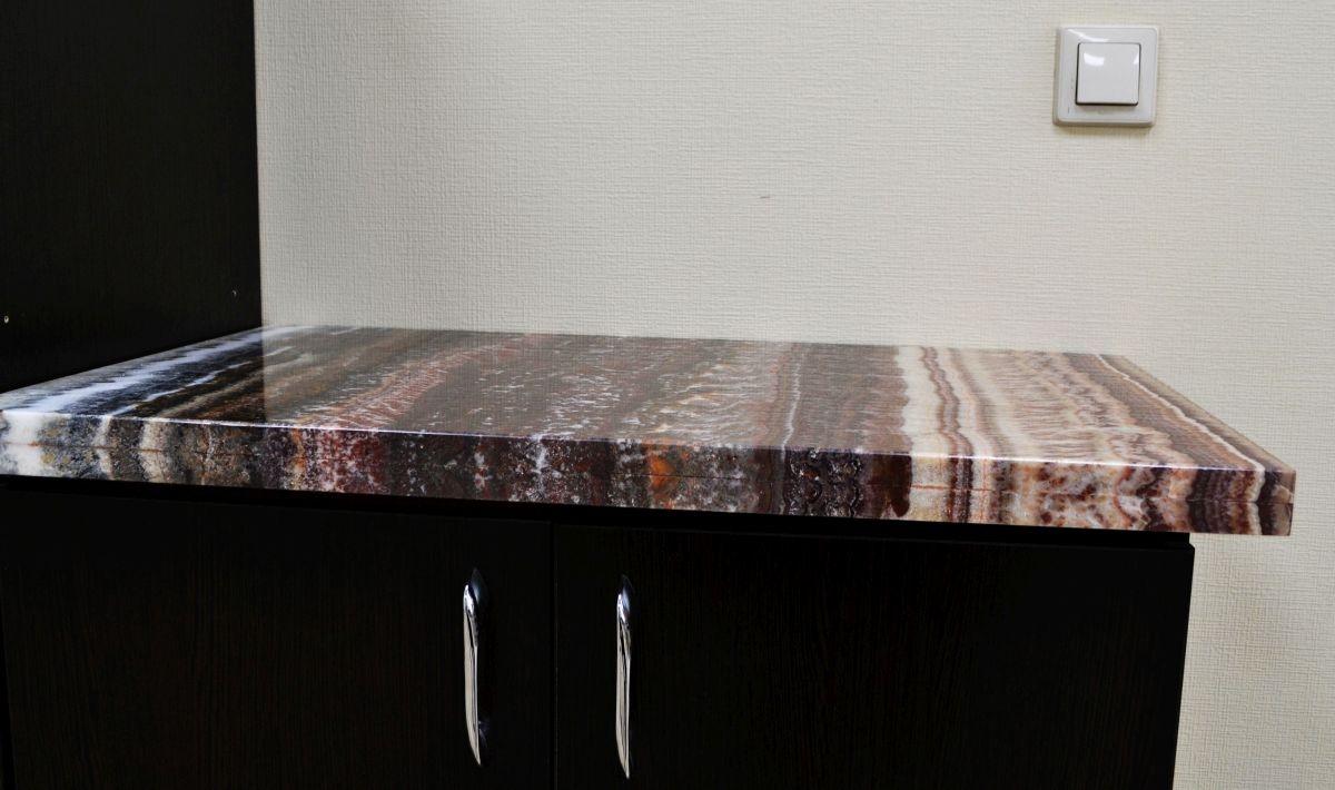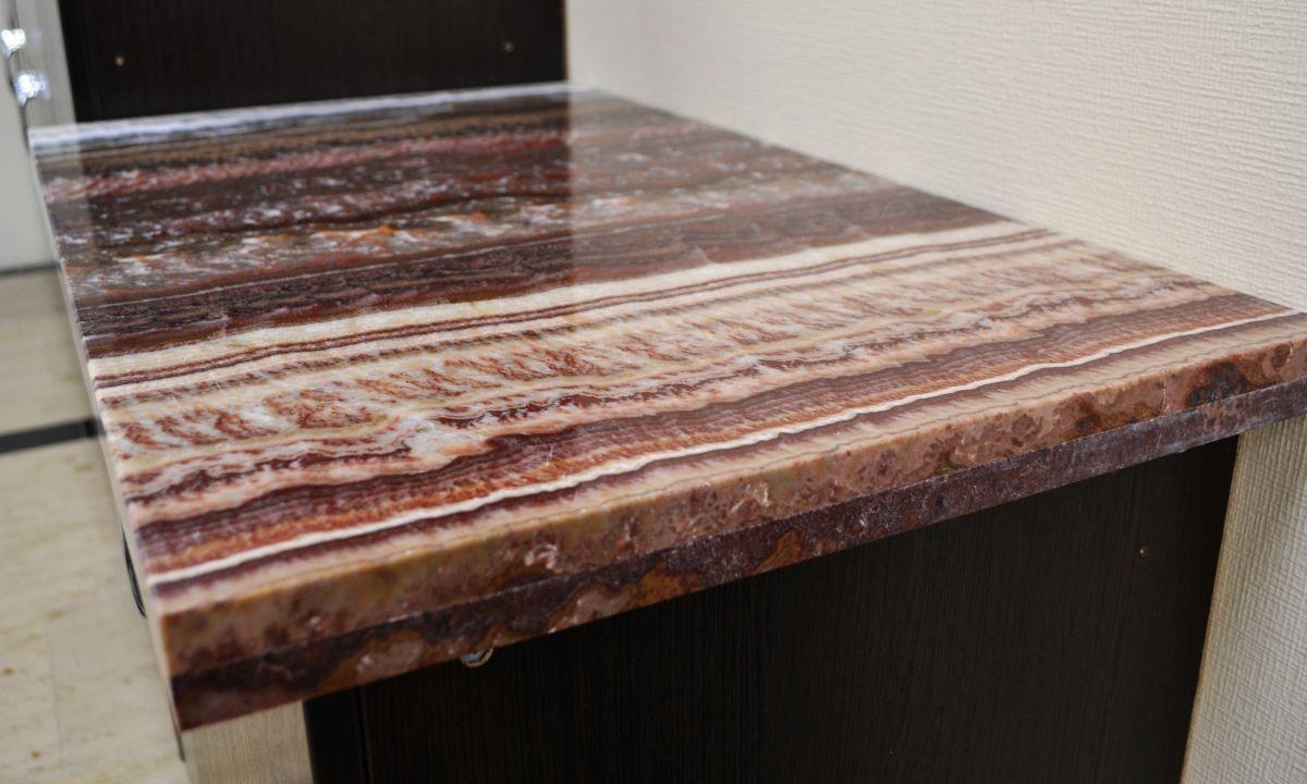 Тумба офисного гарнитура украшена столешницей, выполненной из одного из самых ярких сортов мраморного оникса - Onyx Fantastico. Он обладает роскошной текстурой, сложенной волнистыми линиями разнообразных оттенков: красный, коричневый, оранжевый, бежевый, белоснежный, серый и голубоватый.