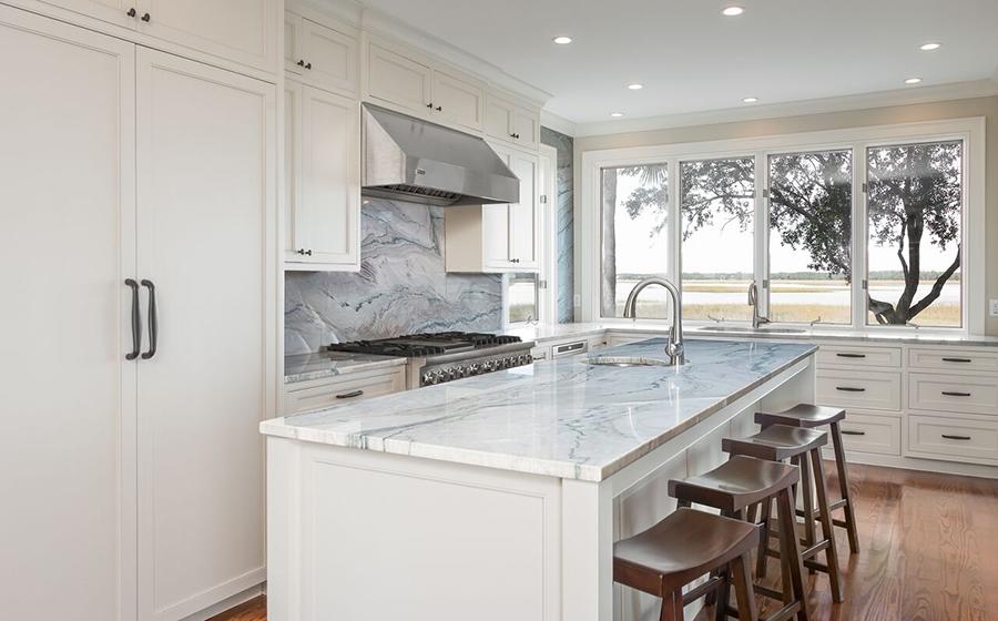 Им покрыты все столешницы - как для рабочей зоны, так и центрального острова. Рабочая зона совмещена с подоконниками, что позволяет готовить в условиях яркого дневного света. К тому же естественное освещение прекрасно раскрывает красоту камня, богатство его текстуры. Крупными плитами этого камня покрыты и стены в зонах фартука.