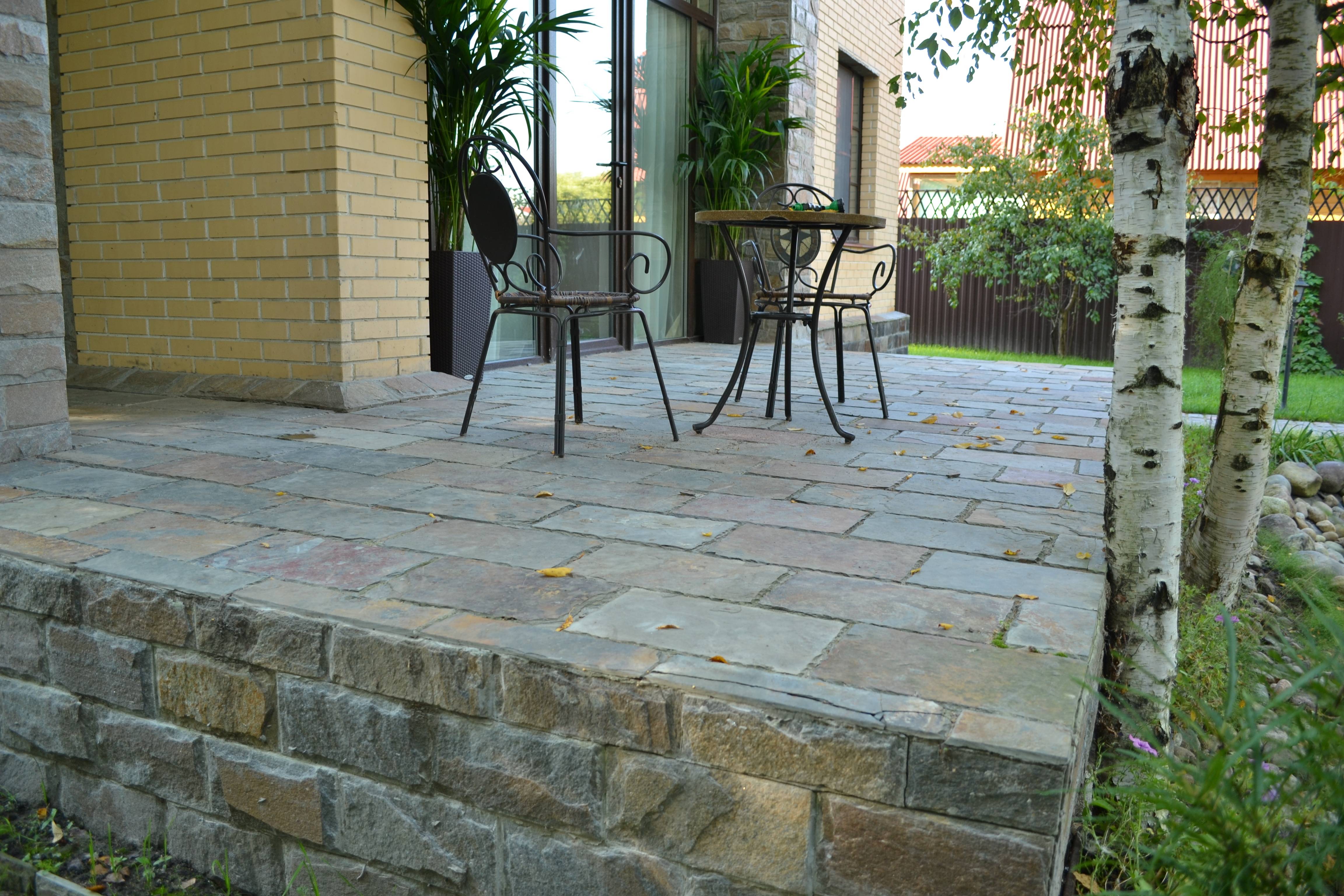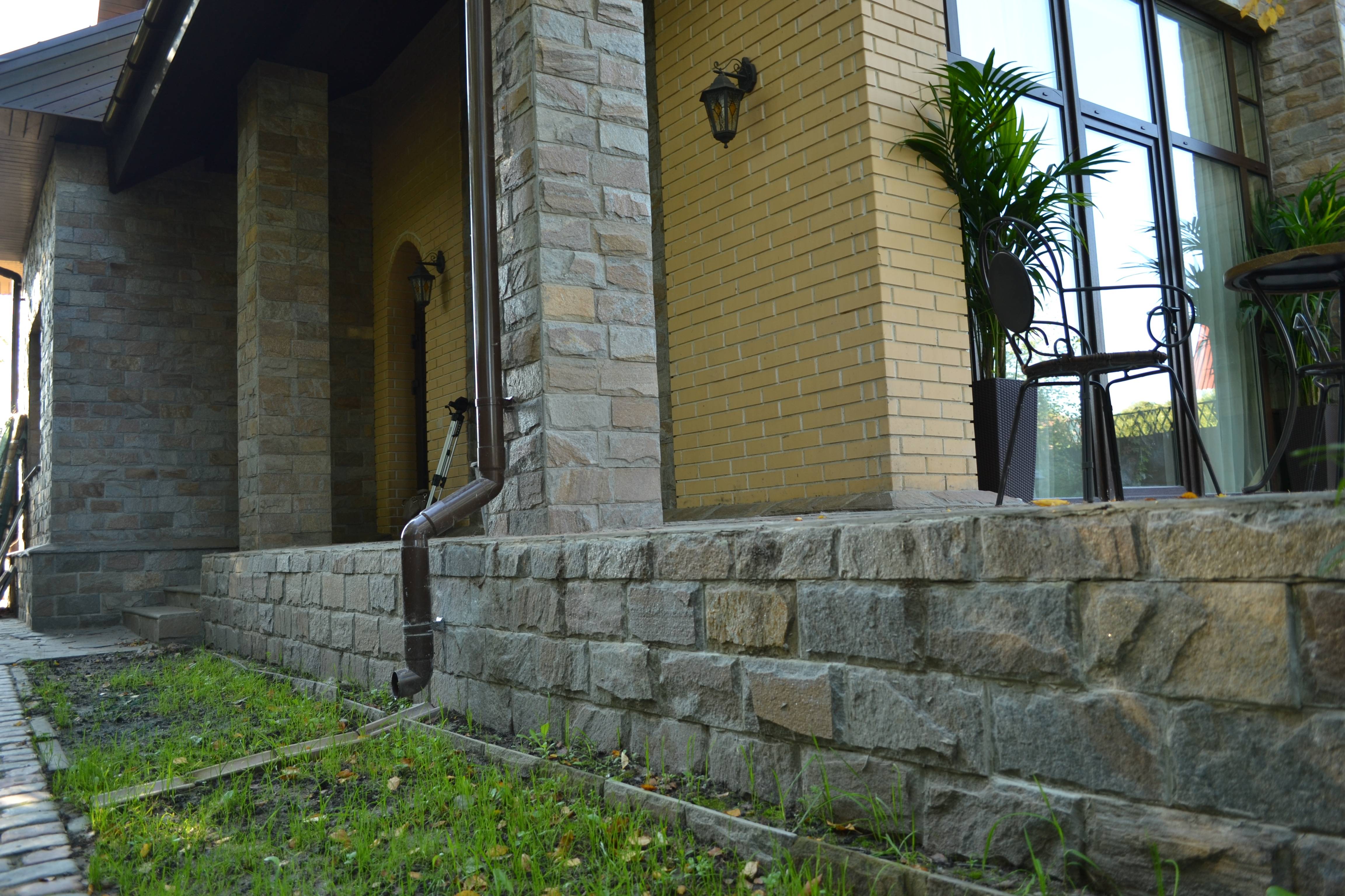 Популярный в нашей стране камень - кварцитосланец "златолит" использован для отделки фасадных и ландшафтных элементов загородного дома. Колотые плитки мерцающего кварцита органично встроену в окружающую среду, придавая архитектуре элегантный, но естественный облик. Были использованы плитки с естественным рельефным краем, и частично - обработанные под фактуру "скала". Был использован кварцитосланец серо-зеленого и бежевого оттенков. В солнечную погоду такой фасад искрится и переливается золотистыми и зеленоватыми чешуйками слюды.
