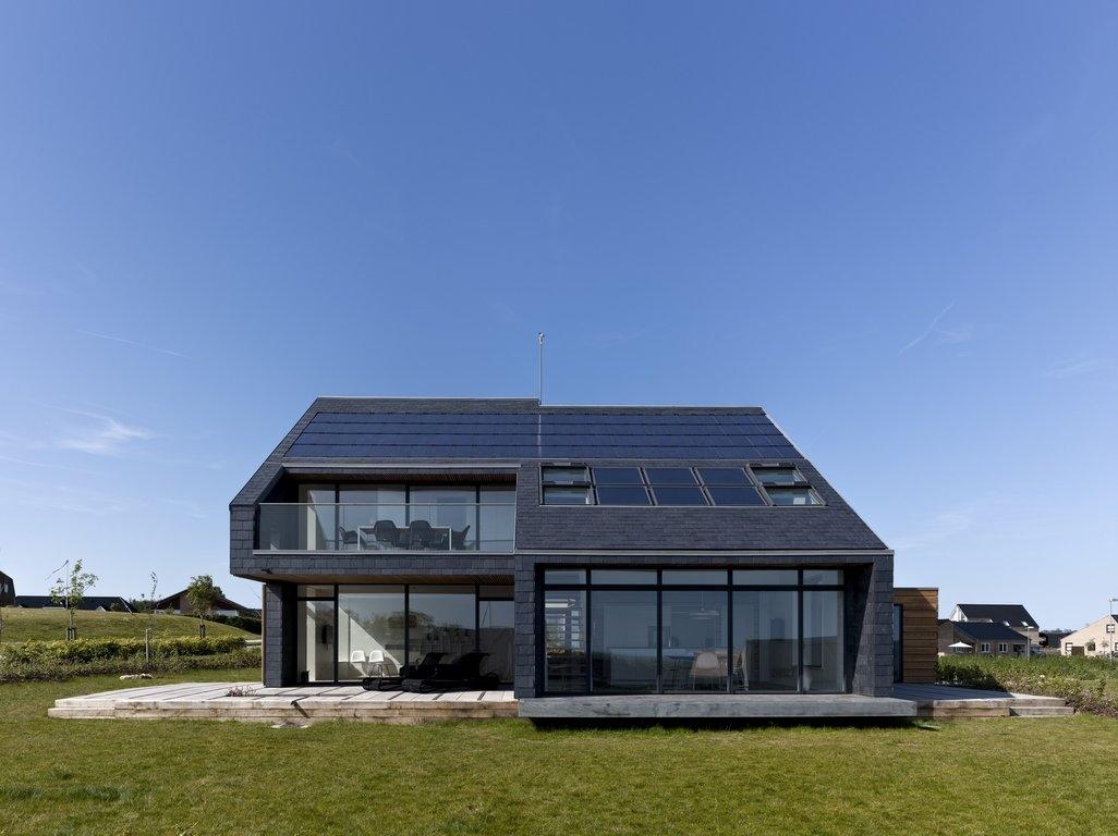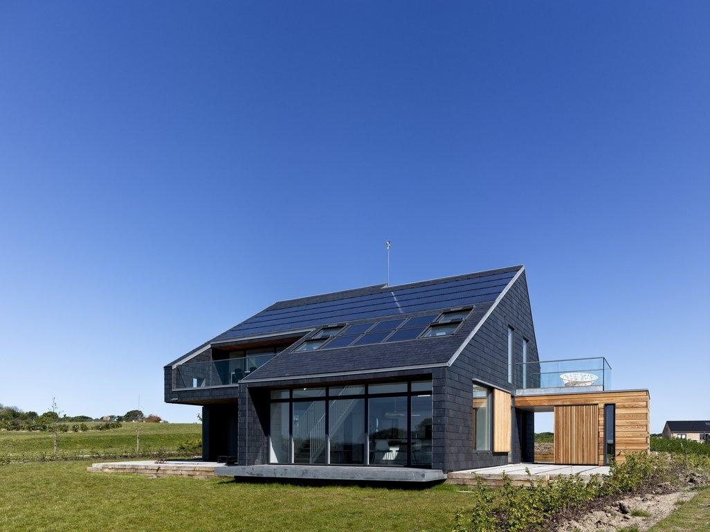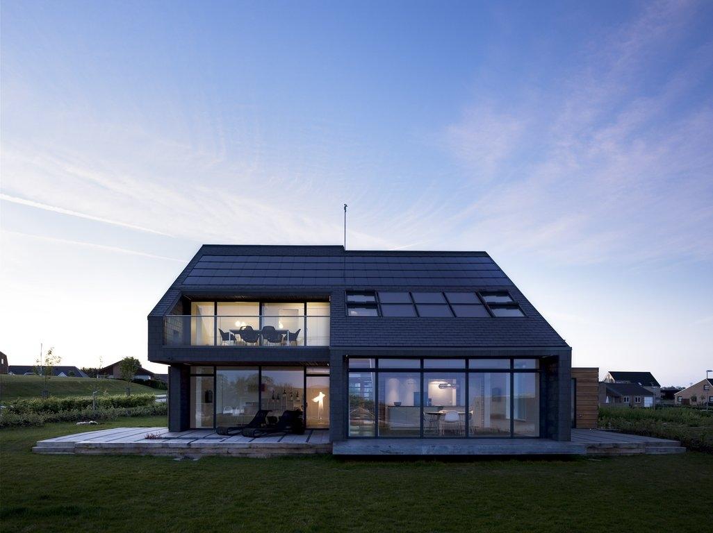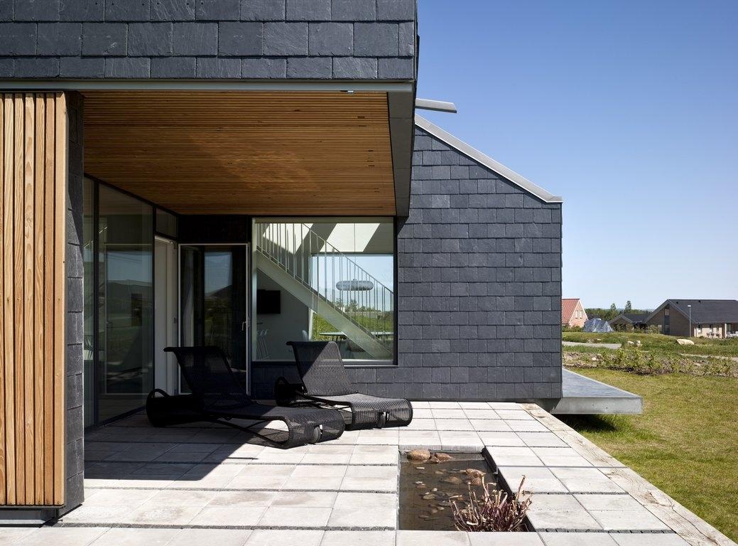 Перед нами проект современного загородного дома, выполненный на стыке стилей конструктивизм и Hi-Tech. Помимо архитектурной концепции, здесь интересен и выбор фасадной отделки. Как известно, новое - это хорошо забытое старое. А как часто сегодня мы видим черепицу, которая долгие столетия была единственным материалом для покрытия крыш? А в этом проекте чешуей из черного сланца покрыта не только крыша, но и фасад дома!