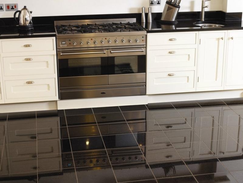 Пол элегантной кухни, выдержанной в классических тонах, облицован плиткой базальта Black Galaxy.