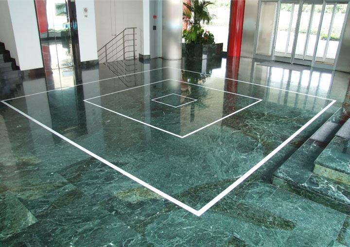 Пол бизнес-центра облицован ярко-зеленым полированным мрамором Verde Guatemala. Это проверенный способ привнести яркую индивидуальность в любой интерьер. Мрамор насыщенно-зеленого цвета заряжает все пространство живительной энергией.