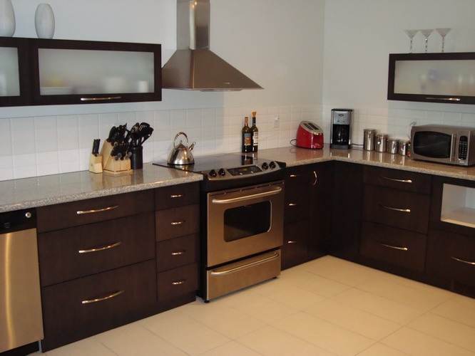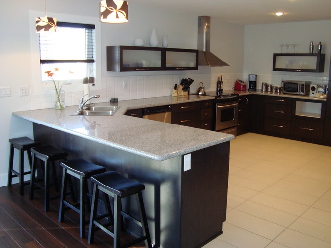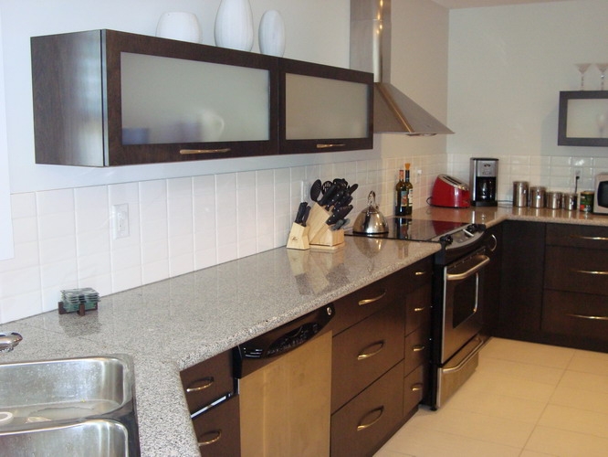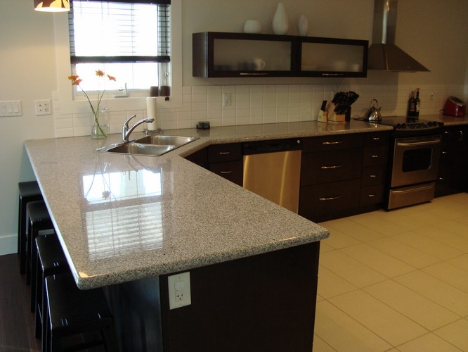 Поверхность рабочей зоны покрыта популярным и недорогим гранитом Bella White. Для проекта были заказаны полированные слэбы толщиной 3 сантиметра.