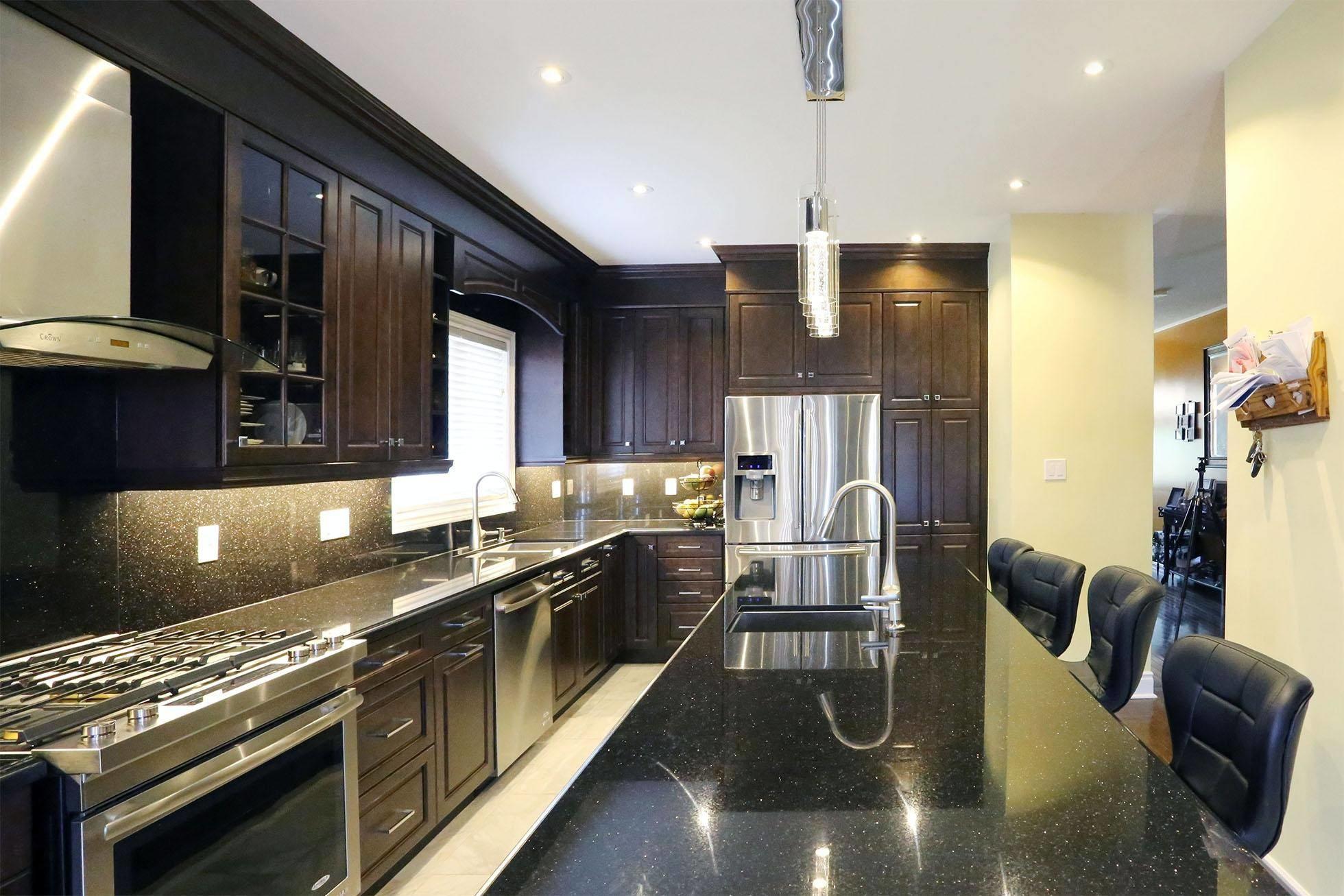Столешницы и фартуки выполнены из черного гранита Black Galaxy. Этот камень в полированной фактурой приобретает глянцевый блеск с зеркальной поверхностью. А при грамотном распределении источников освещения гранит начинает искриться и мерцать множественными вкраплениями.
