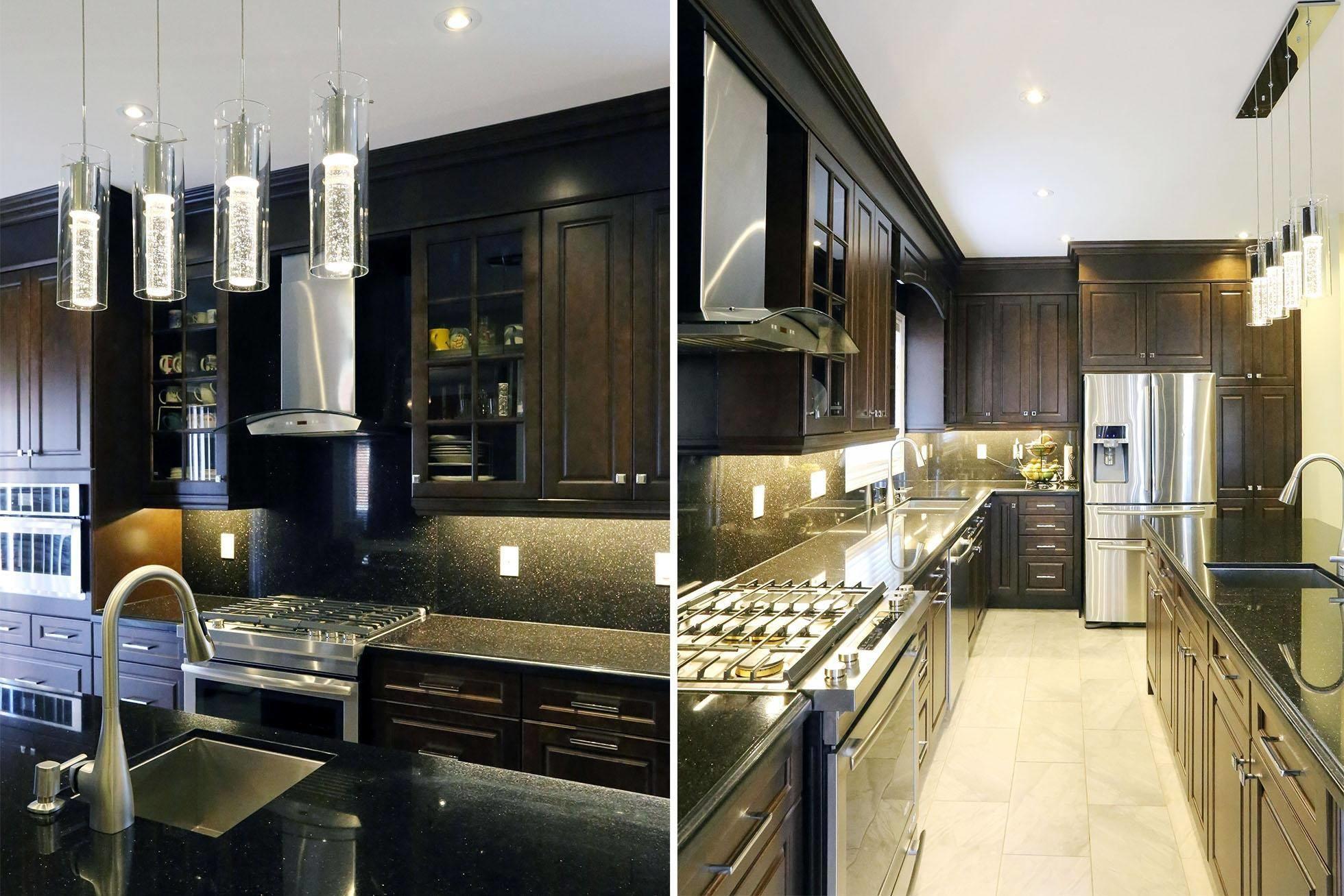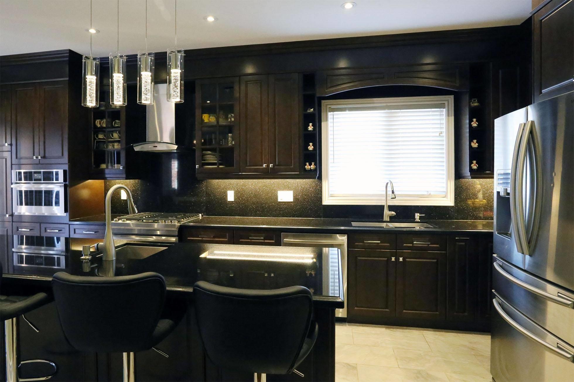 Перед нами проект стильной и функциональной кухни. Весь дизайн выполнен в темных оттенках, с элементами цвета металлик.
