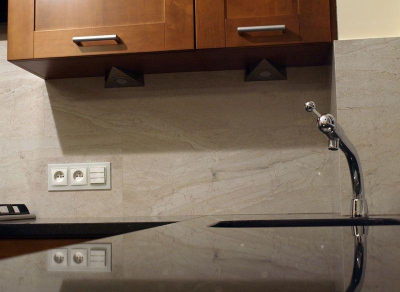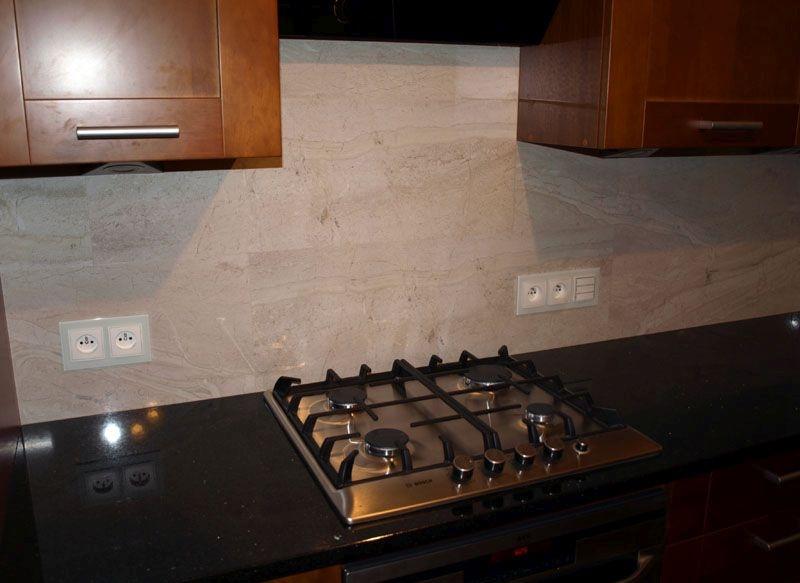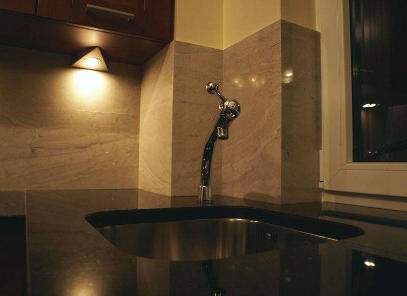 Прежде всего, из этого гранита была спроектирована столешница для рабочей зоны с вырезами под варочную зону, раковину и сантехнику. У окна столешница плавно переходит в подоконник. Как известно, Black Galaxy удивляет своими прочностными свойствами - он не восприимчив к жидкостям и бытовым веществам, его сложно поцарапать. Black Galaxy - это один из лучших материалов для создания кухонных столешниц.