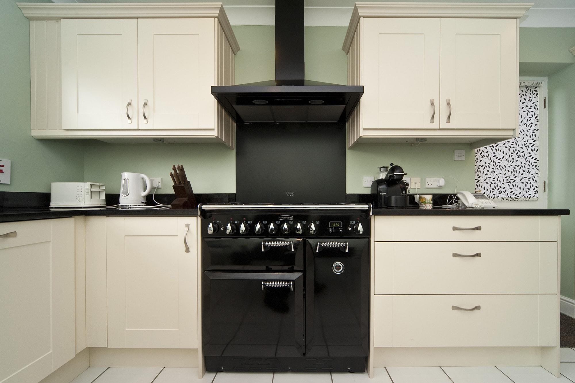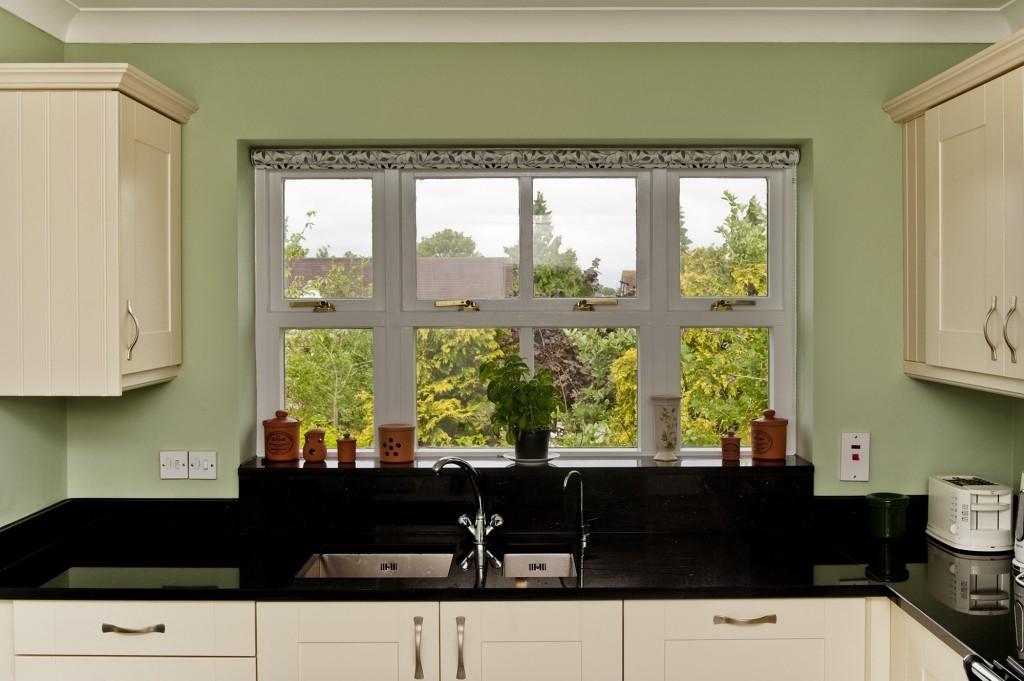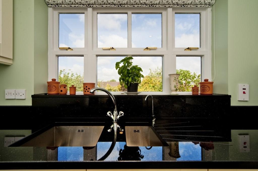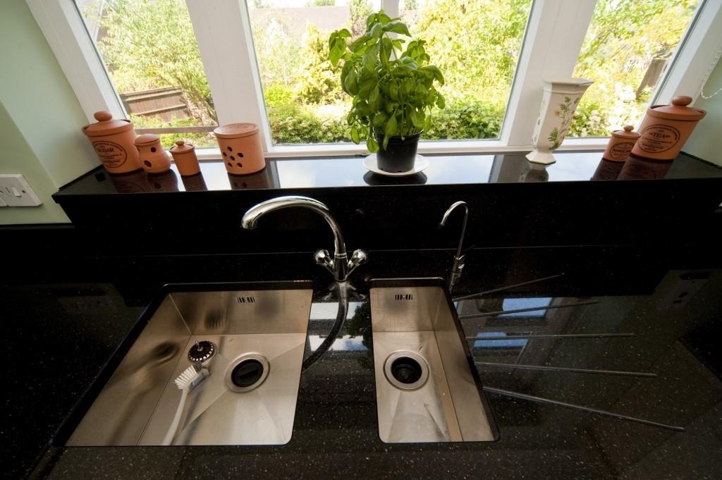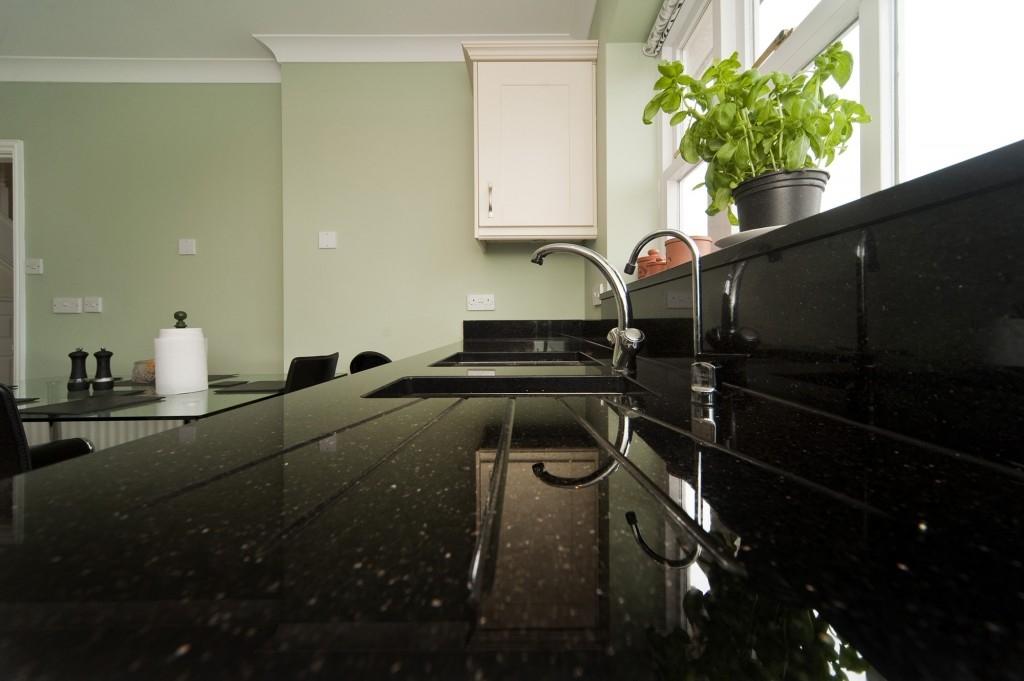 Из этого гранита выполнены все рабочие поверхности по периметру кухни. В зоне окна столешница переходит в невысокий плинтус, а дальше - в подоконник.