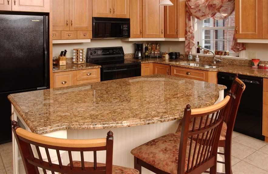 Представленная на фото кухня обладает теплой и спокойной энергетикой, она уютна и демократична. Кухонный гарнитур из светло-рыжей древесины прекрасно перекликается со столешницами, вырезанными из розовато-бежевого гранита Giallo Fiorito.